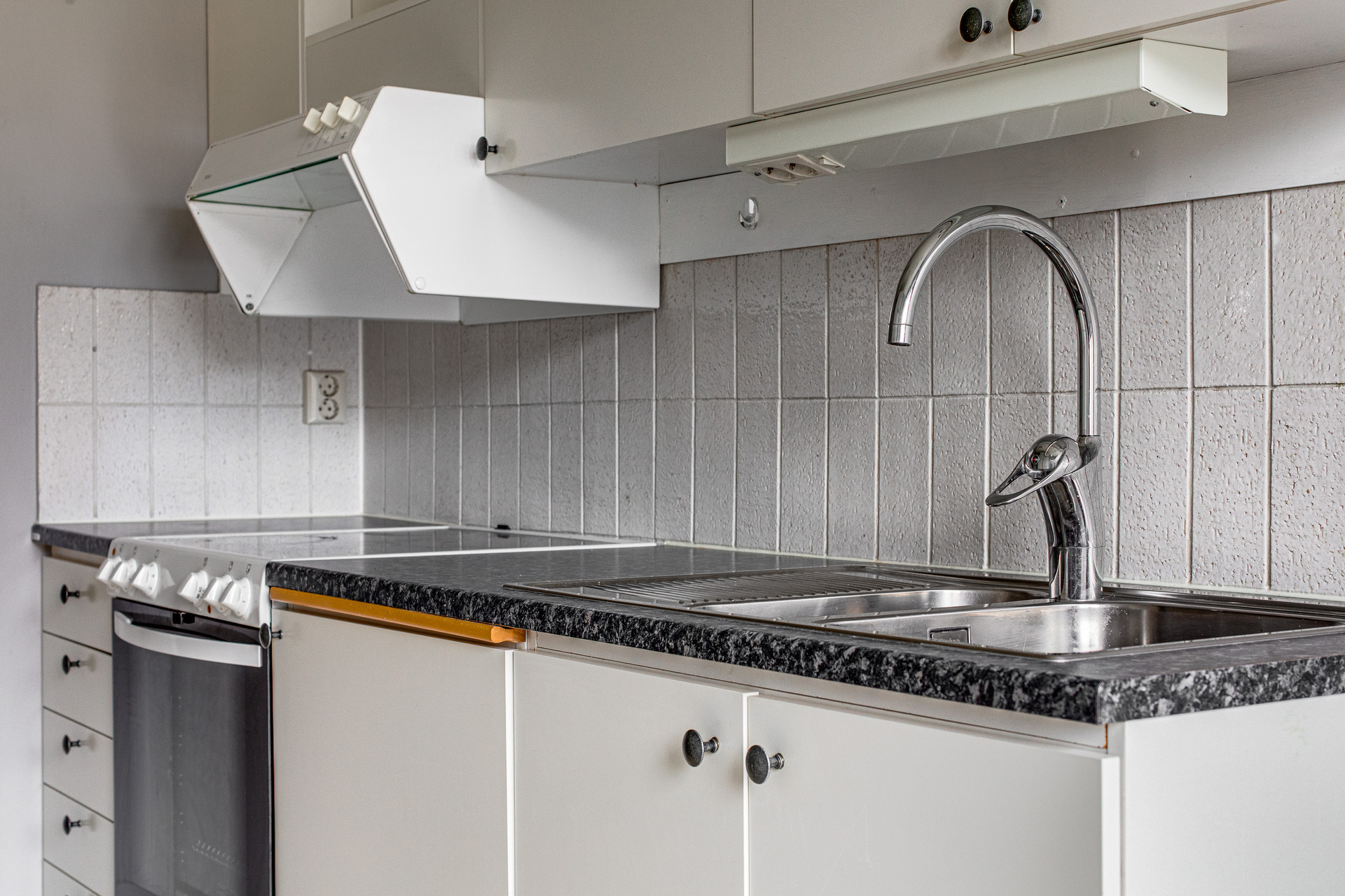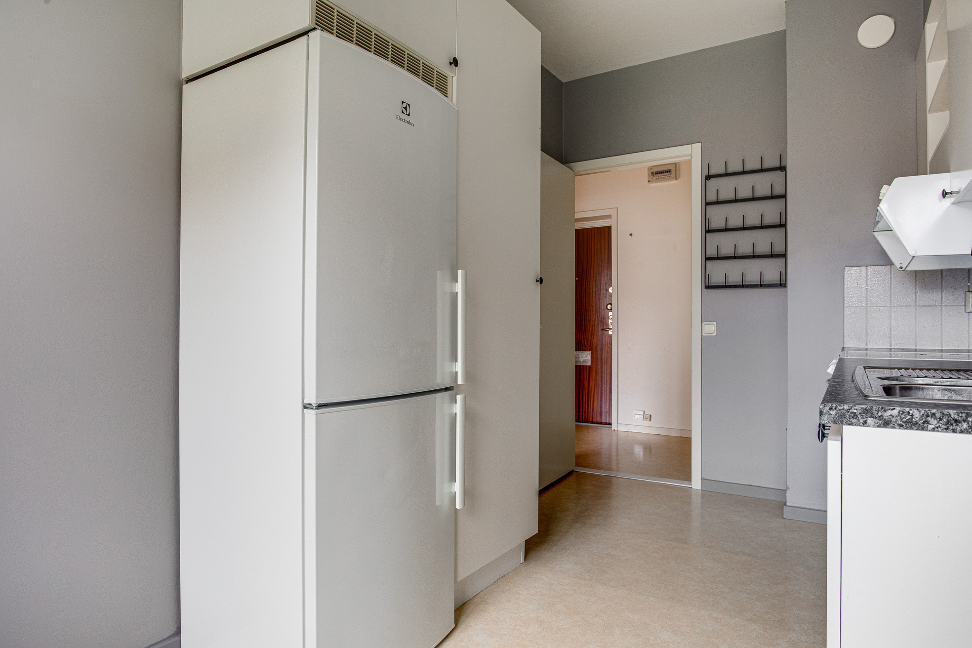 Mysigt kök med plastmatta på golvet och målade väggar i ljusgrå ton. Köket är utrustat med kyl, frys, spis, ugn och fläkt.