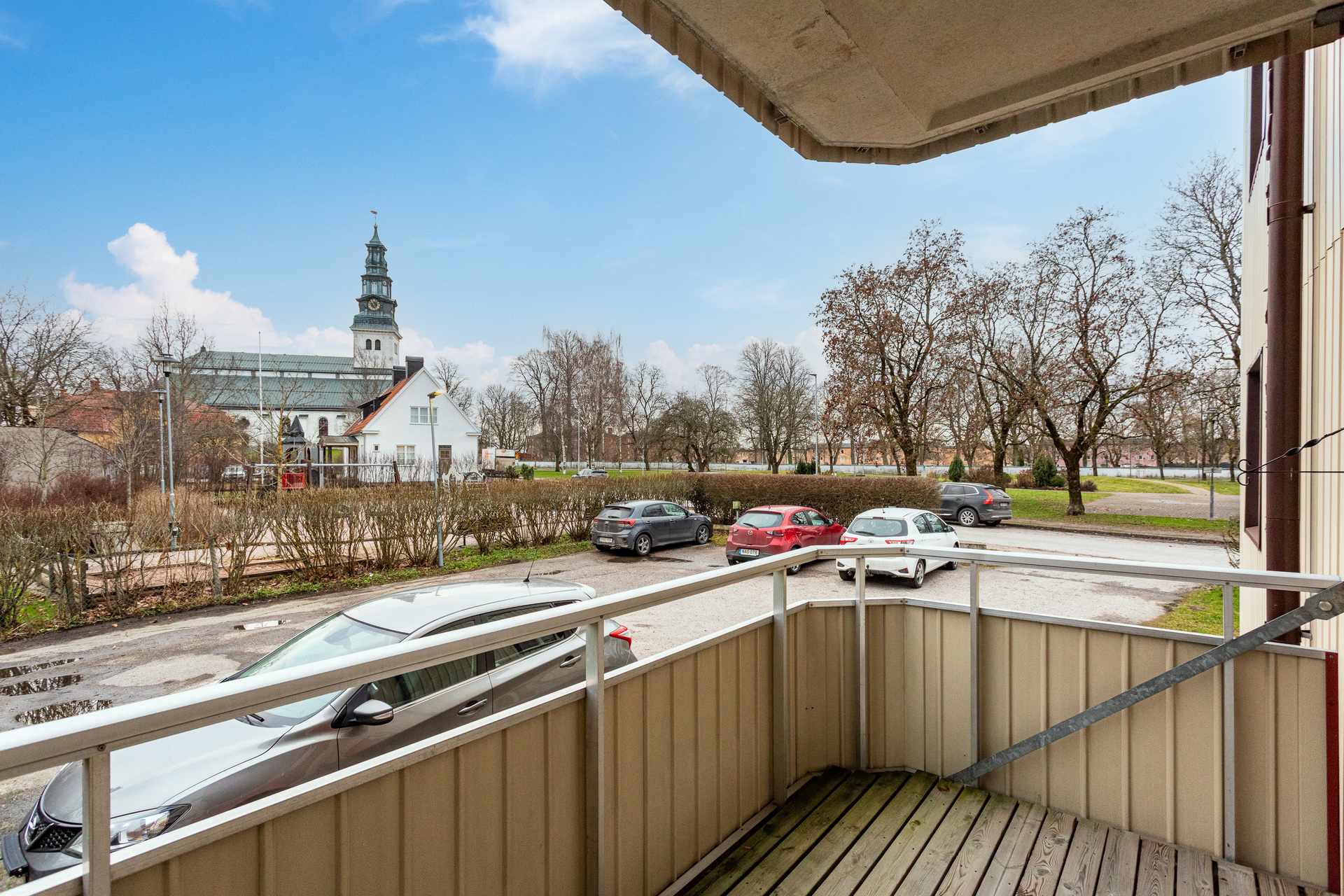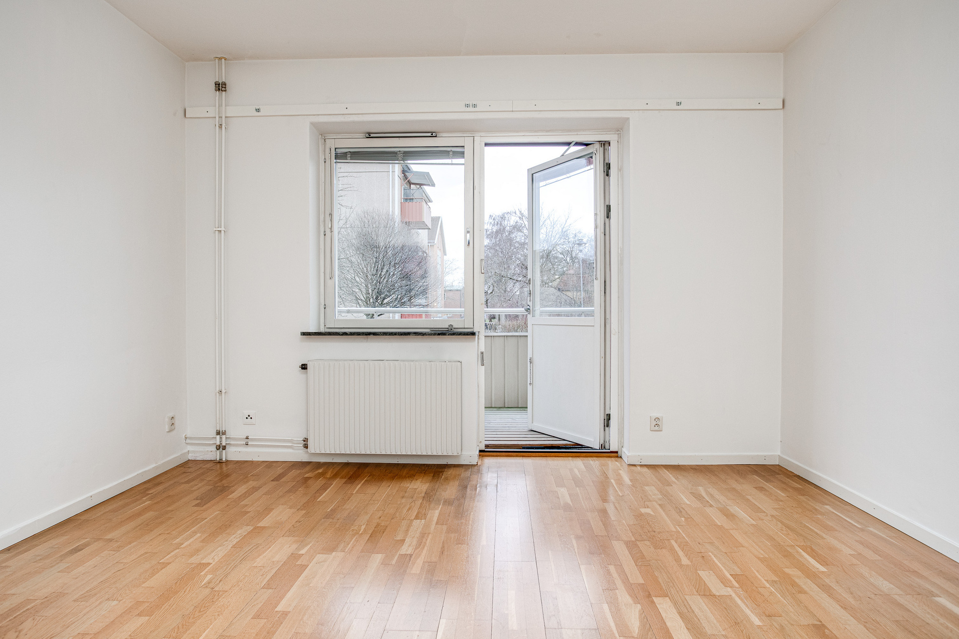 Ljust vardagsrum med parkettgolv och målade väggar. Från detta rum når du även balkongen som ligger i ett härligt sydöstläge med utsikt mot Bivurparken och Köpings kyrka.