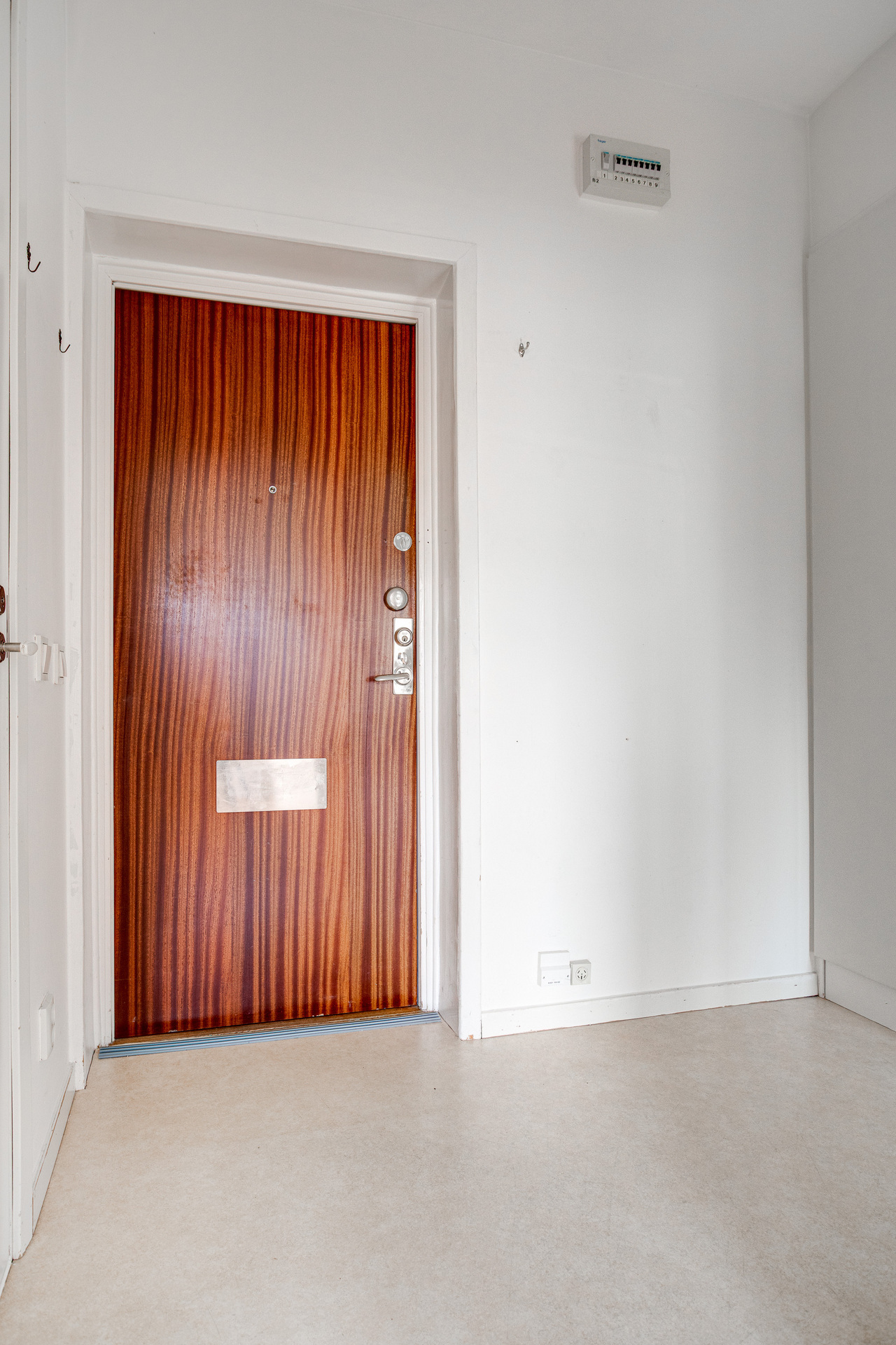 Hall med plastmatta, målade väggar och garderober.