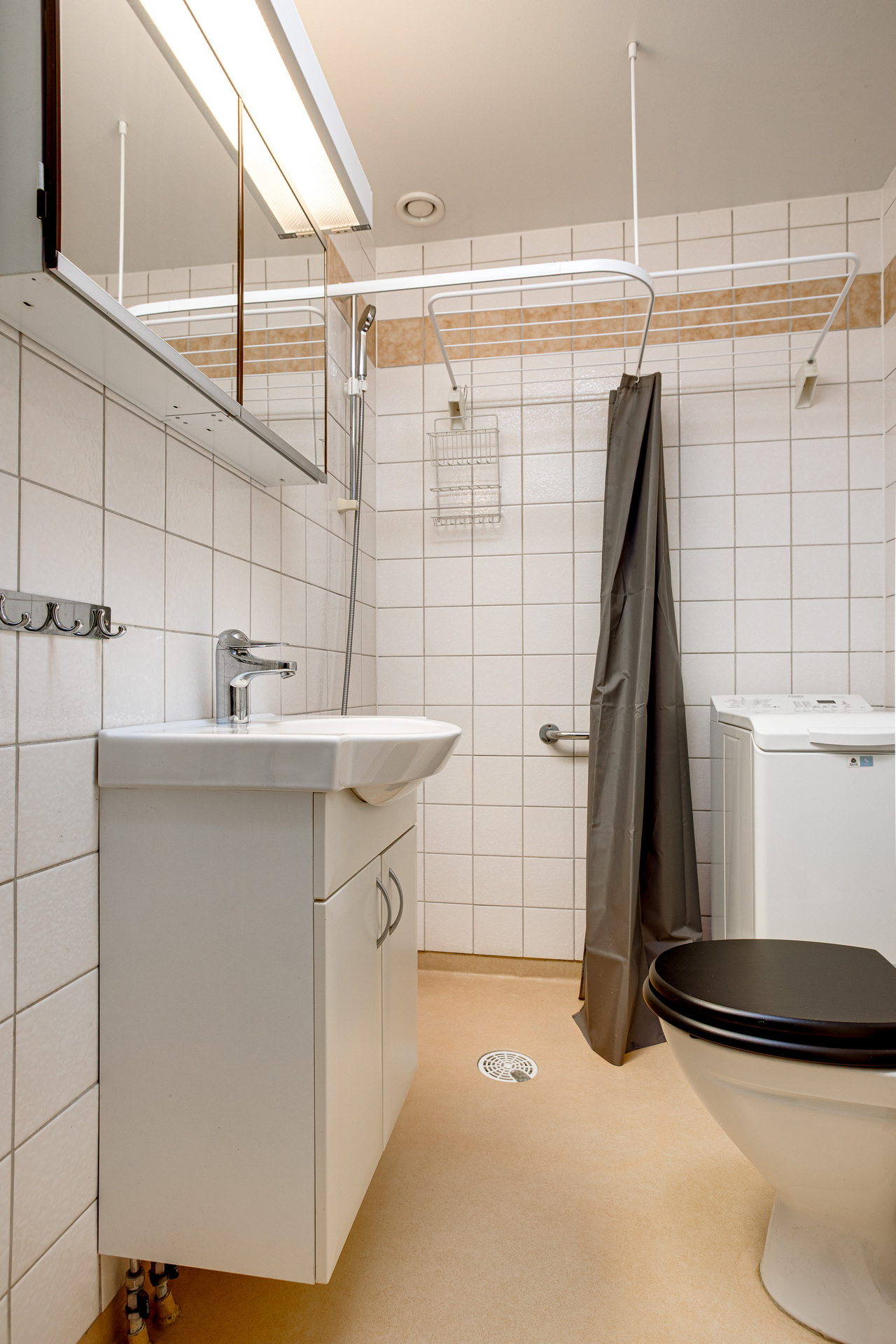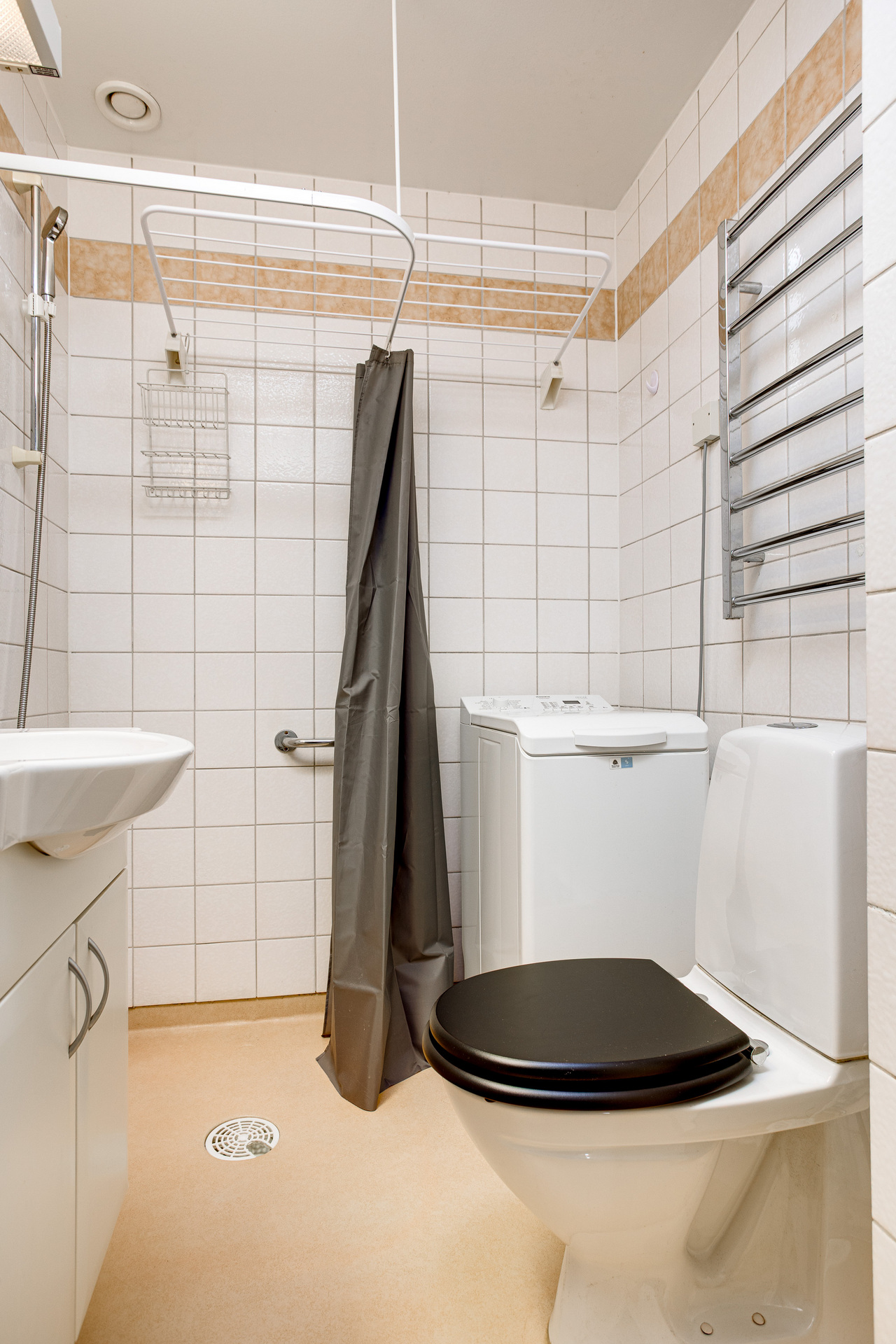 Rymligt badrum med helkaklade väggar och våtrumsmatta på golvet. Badrummet är inrett med toppmatad tvättmaskin, handdukstork, duschplats, toalettstol och handfat.