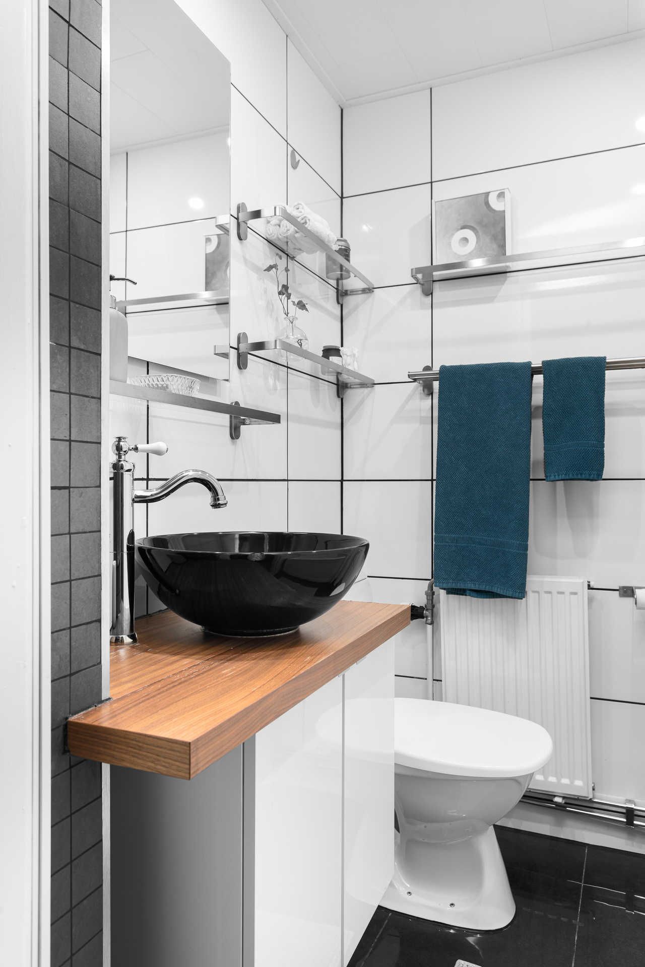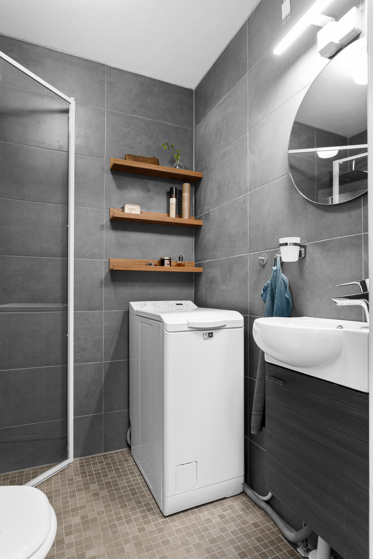 Renoverat badrum från 2022 (våtrumsintyg finns ej). Kakel och klinker i härlig grå ton. Badrummet ät inrett med toalettstol, handfat, duschplats med skjutbara väggar och tvättmaskin.