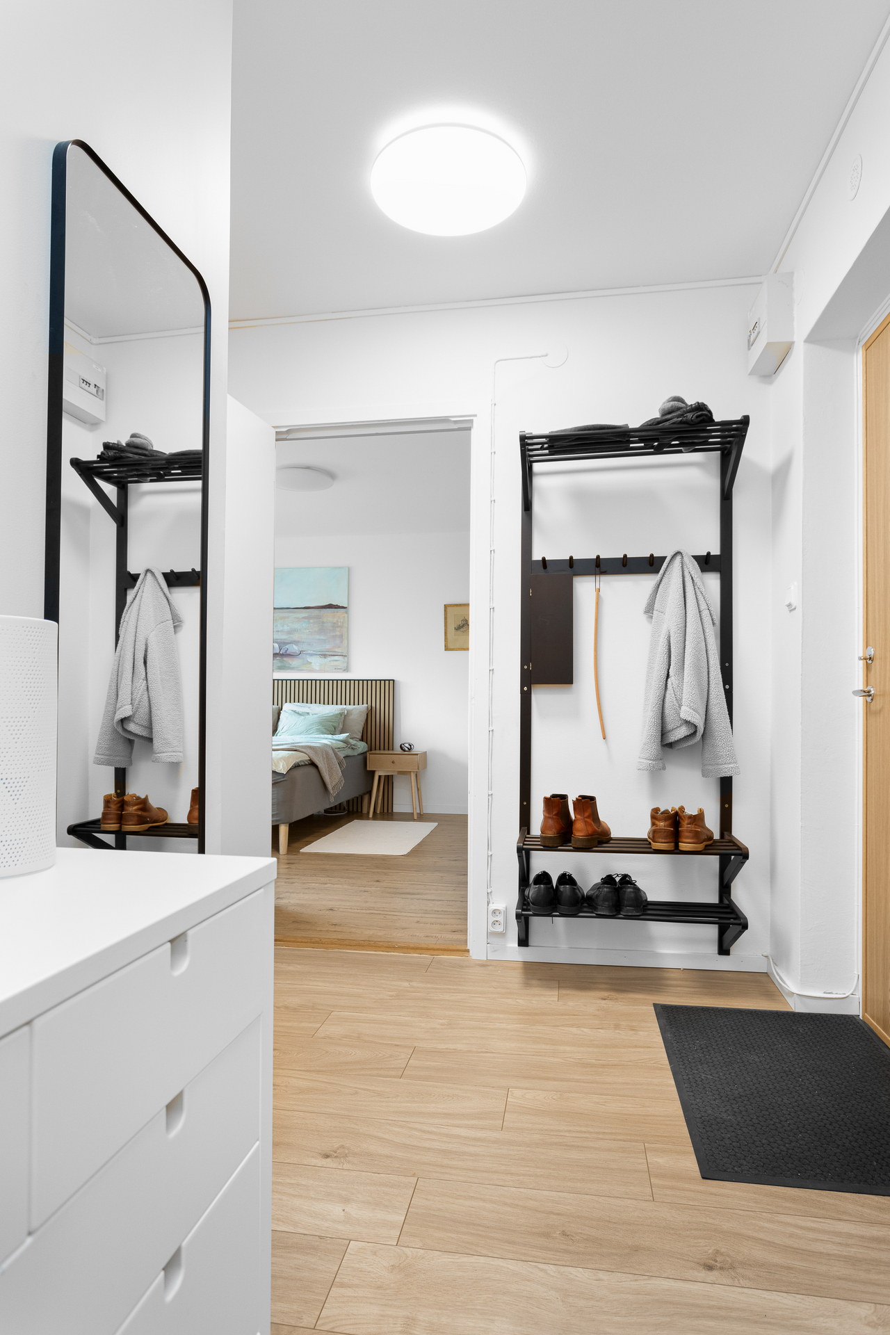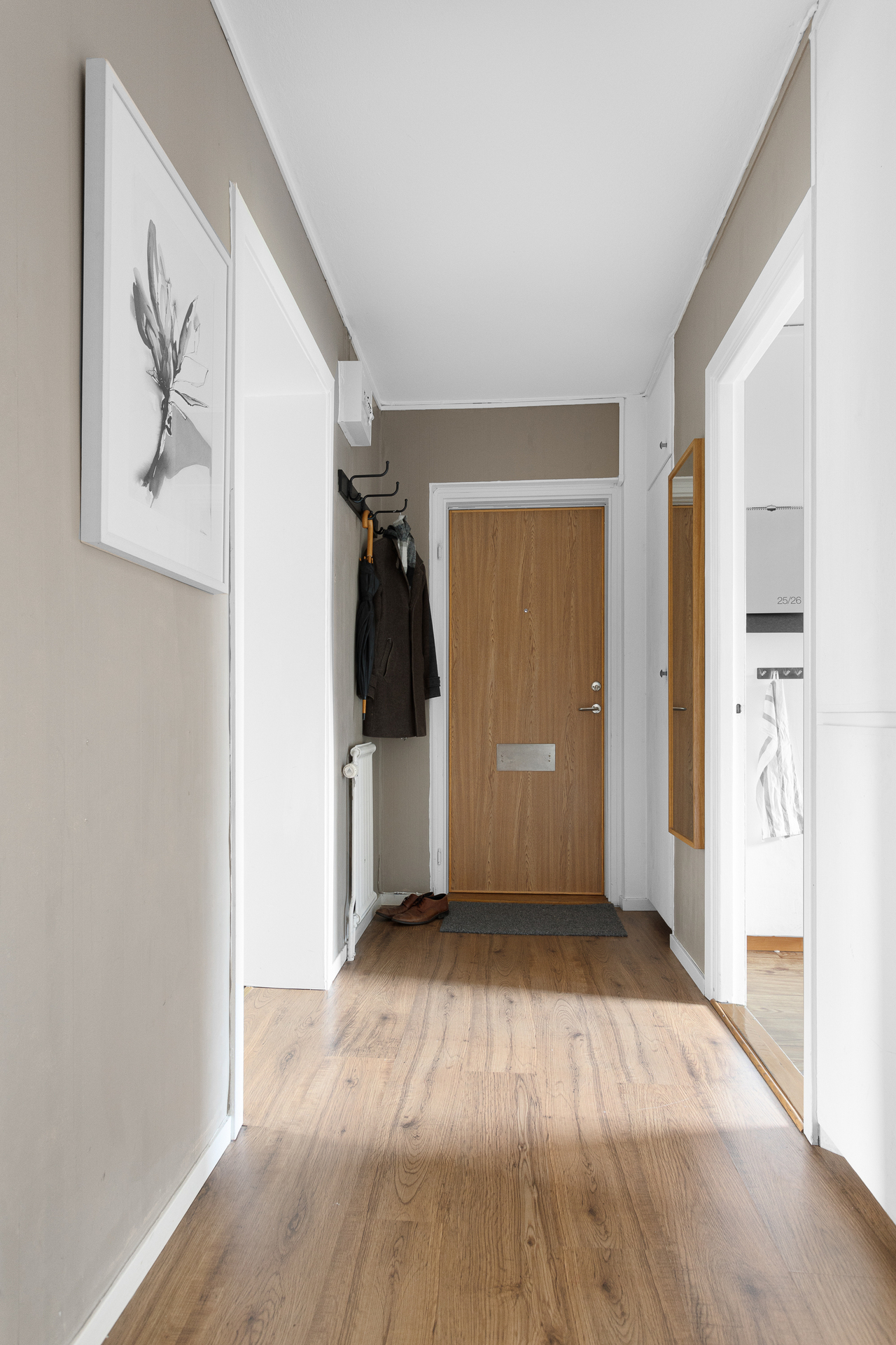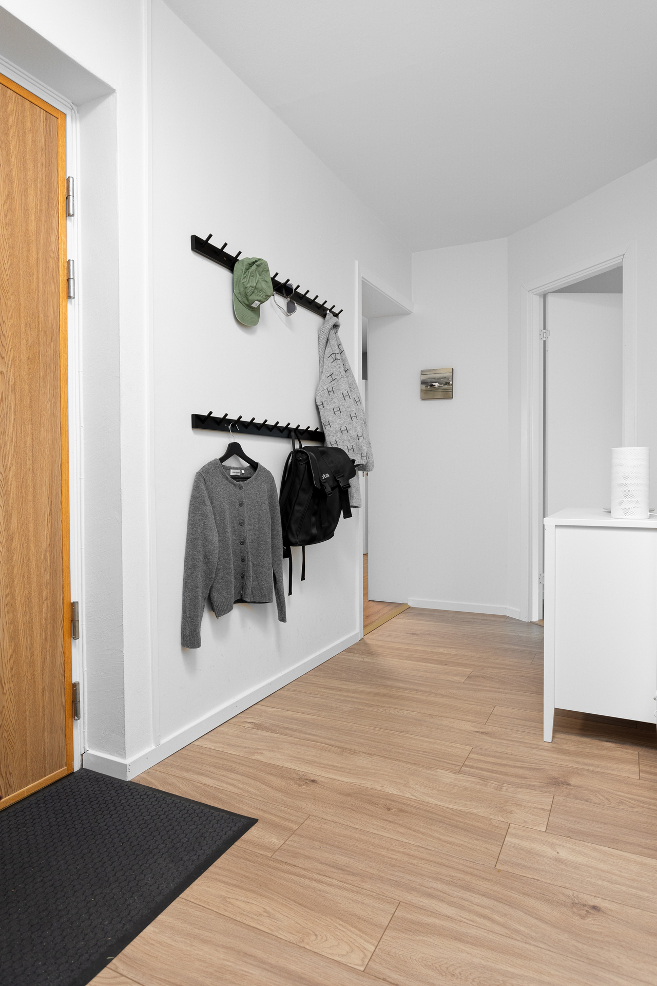 Nyrenoverad hall med gott om plats för avhängning av ytterkläder och skor. Här finns slitstarkt laminatgolv med vitmålade väggar.