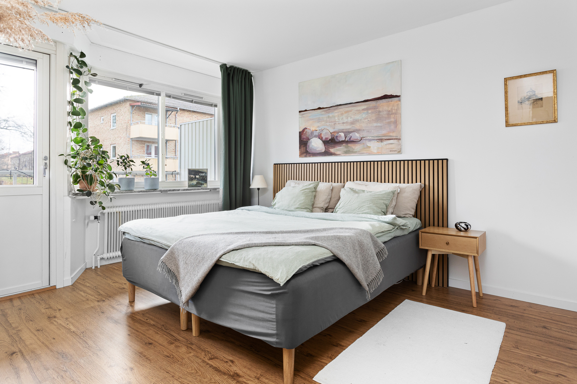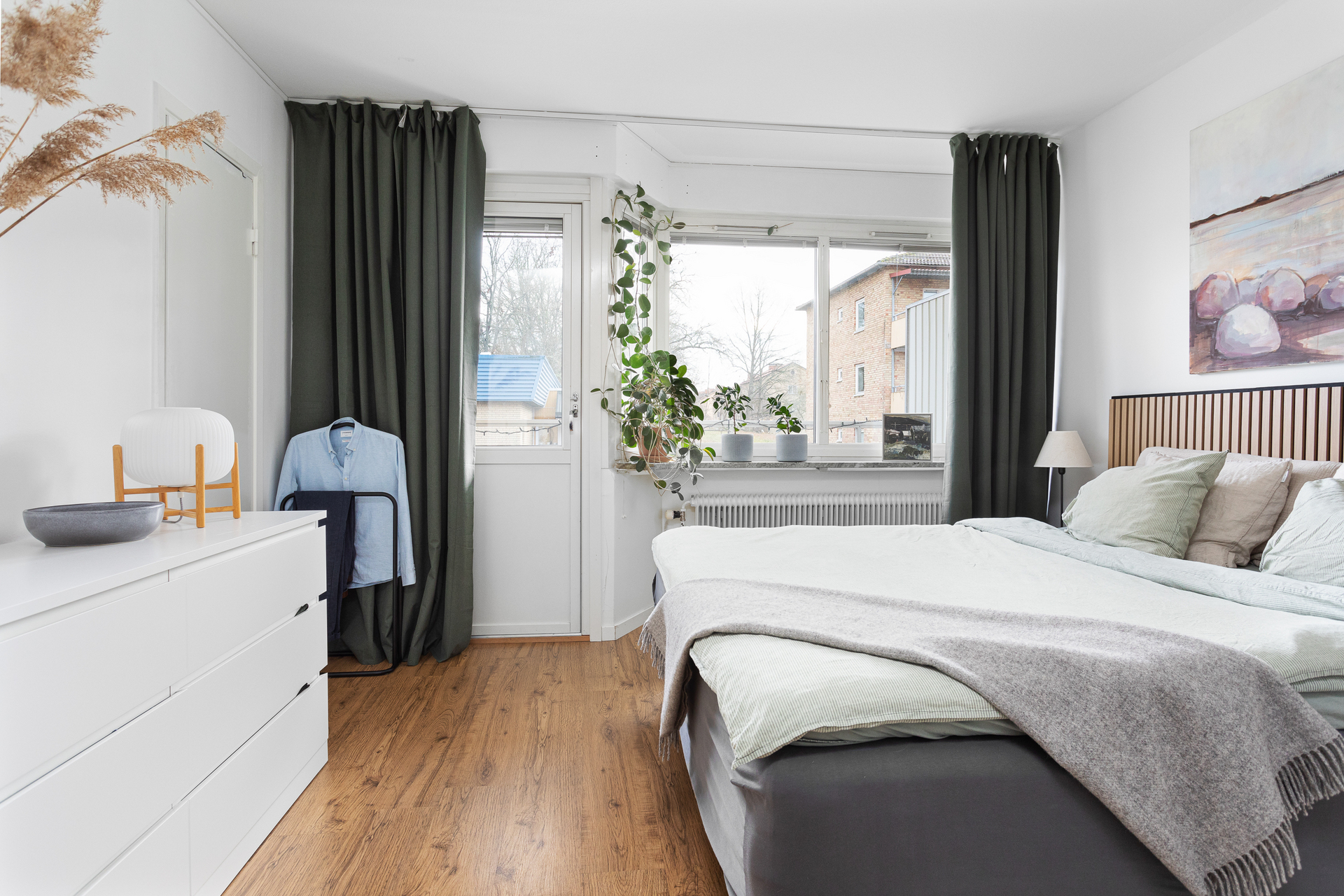 Rymligt sovrum med klädkammare, laminatgolv, målade väggar och tapeter från 2024. Från detta rum nås den andra balkongen i bostaden.