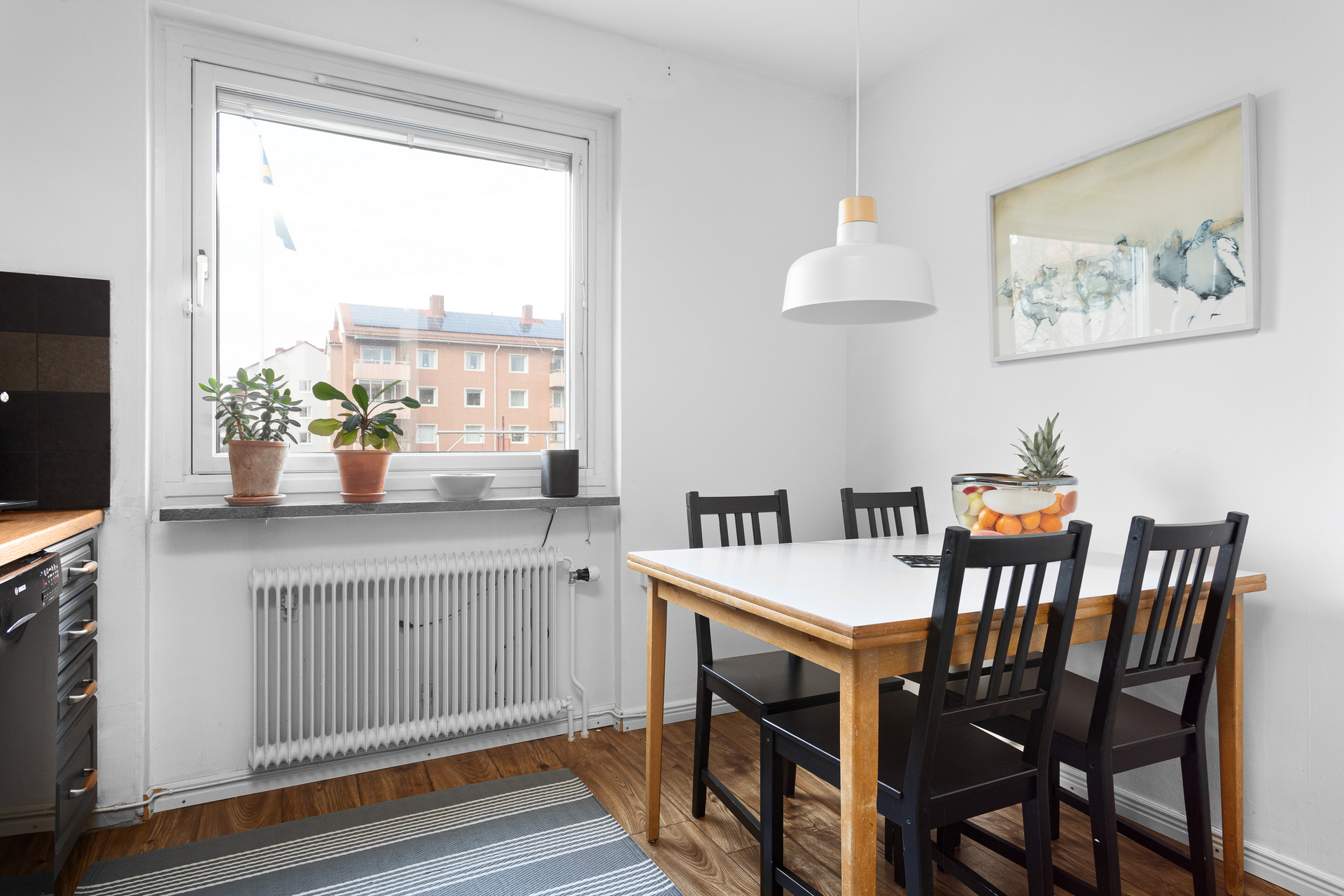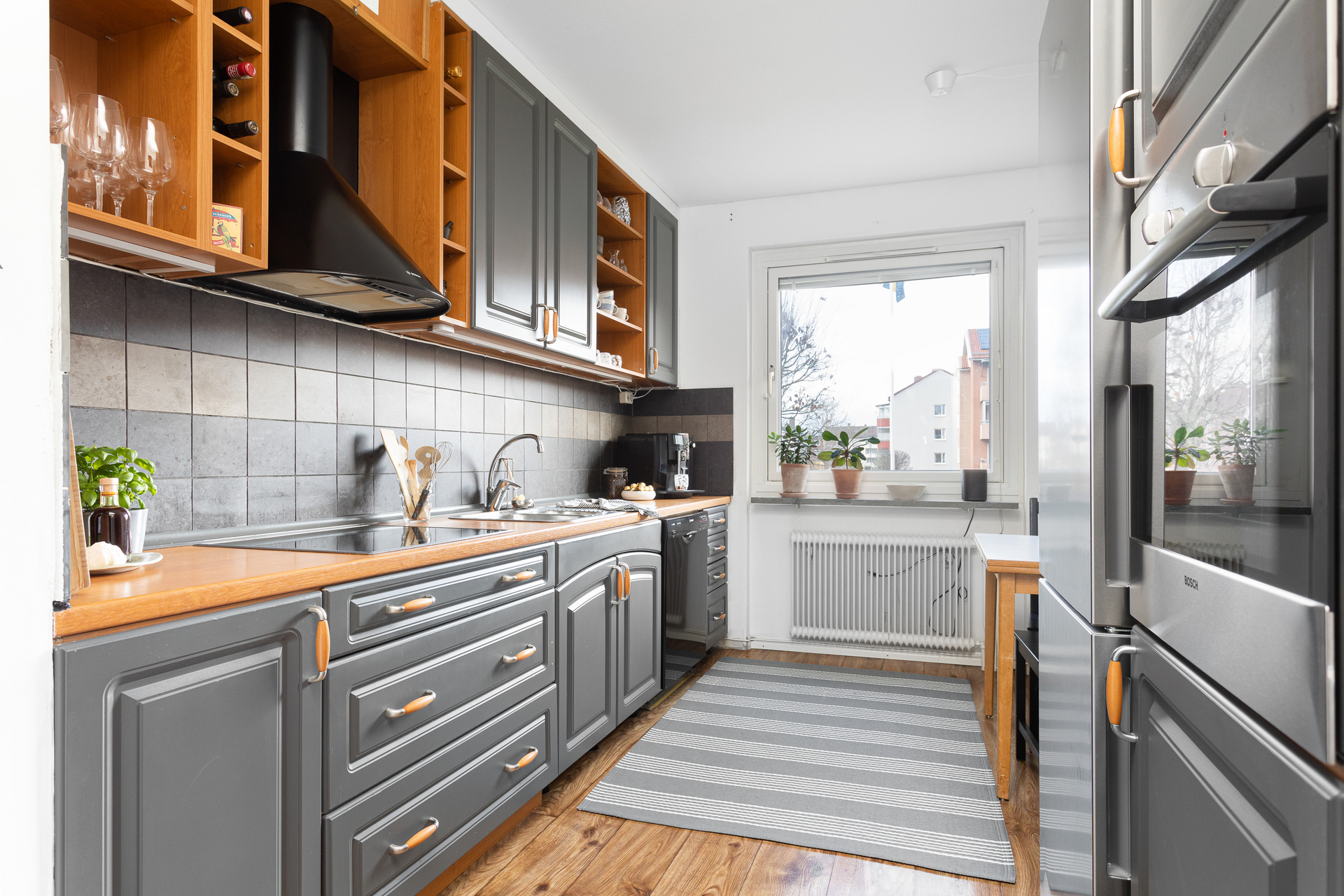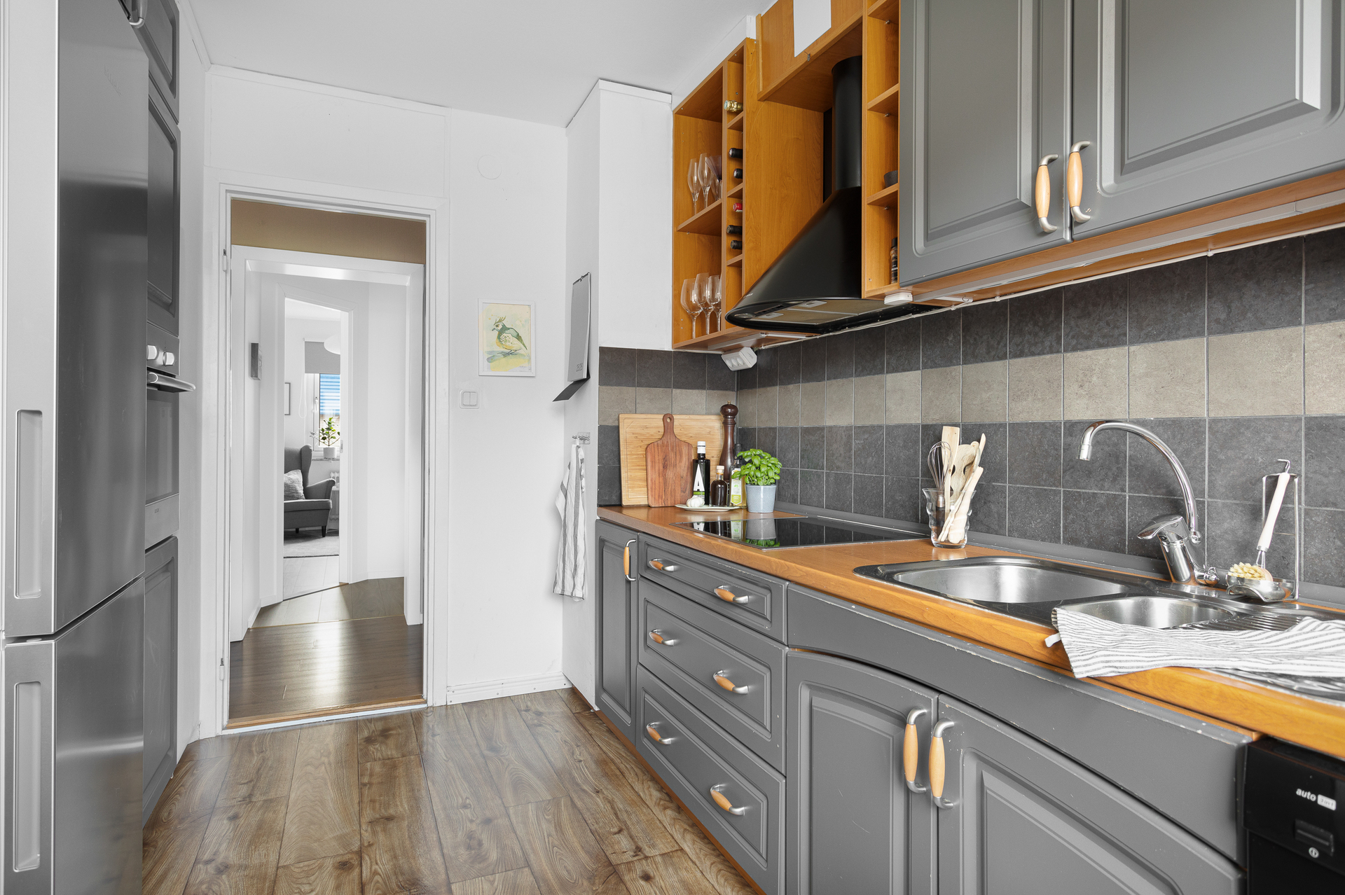 Delvis renoverat kök från 2021 med nytt kakel, ny bänkskiva, målade luckor och -väggar. I köket finns även plastmatta på golvet samt inbyggd ugn, fläkt och diskmaskin. Kyl och frys ny från 2025.