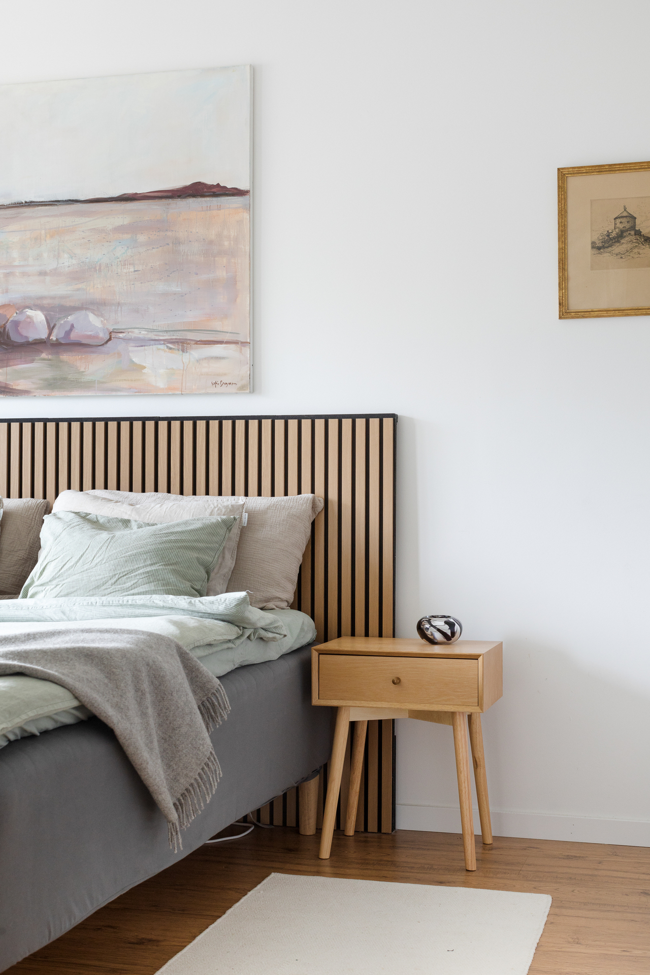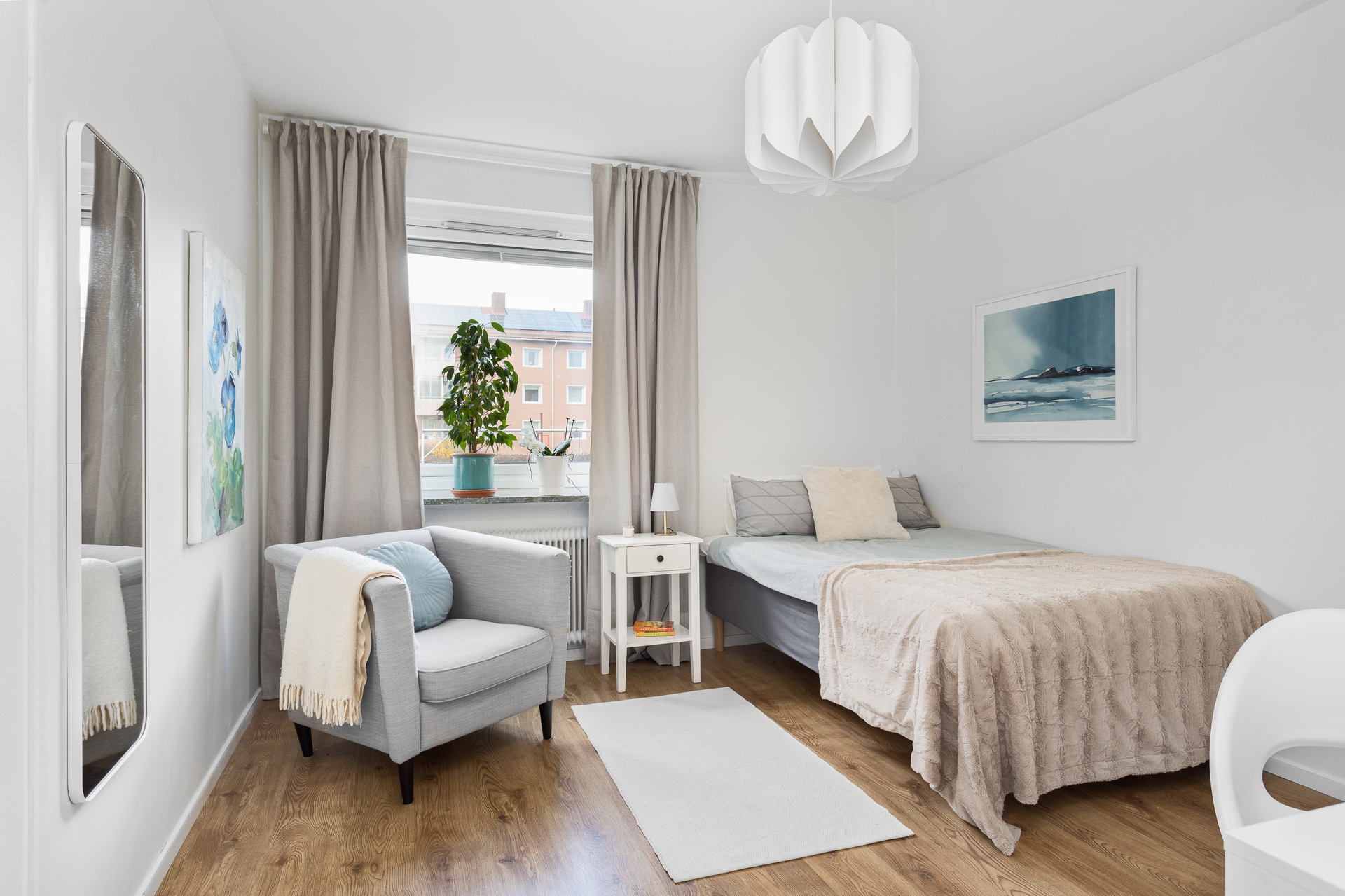 Totalrenoverat sovrum med slitstarkt laminatgolv och vitmålade väggar.