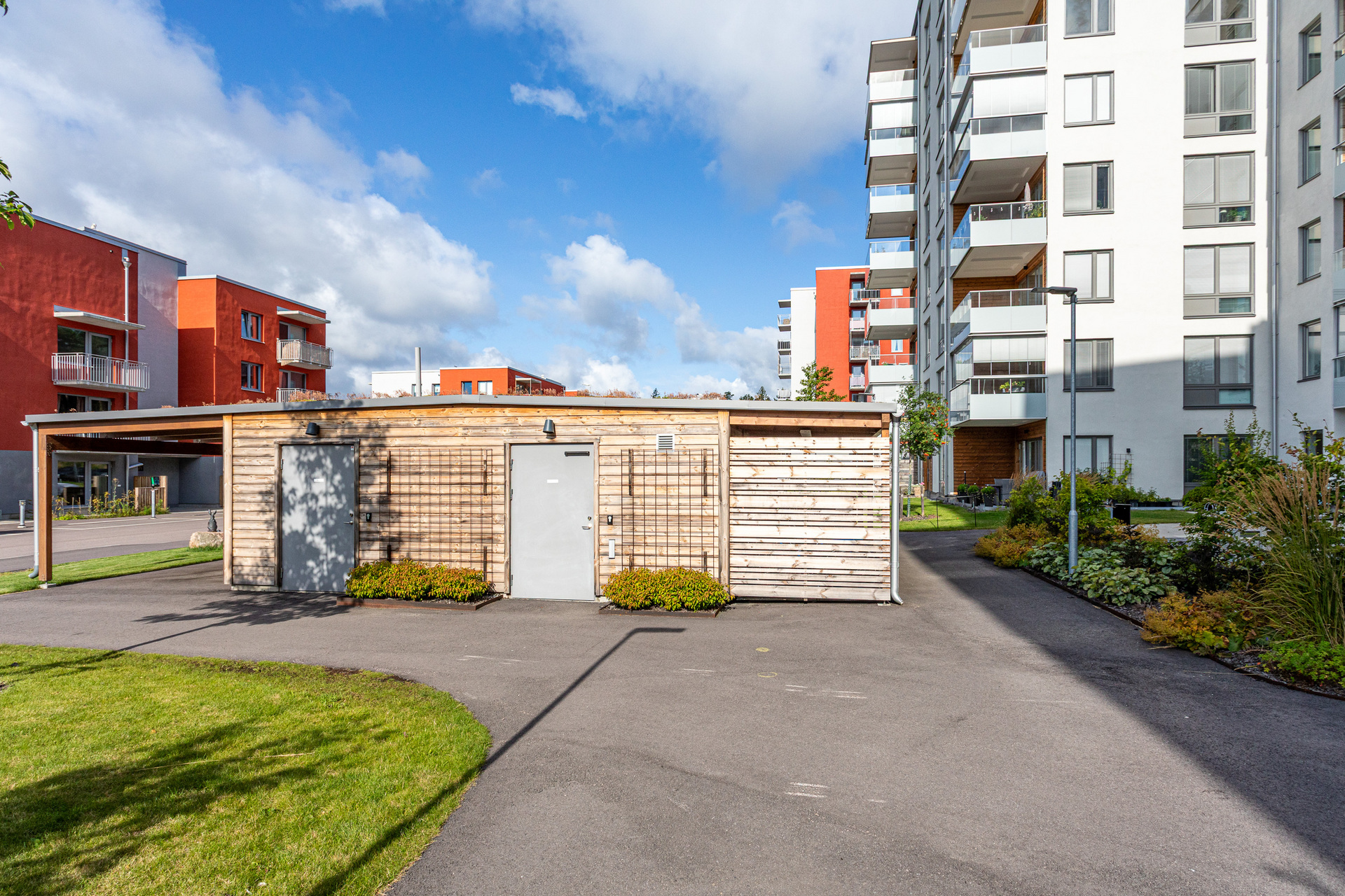 Övernattningslägenhet finns i hus 31, lånas av medlemmar mot en låg kostnad. Cykelhus/förråd x 2, miljörum, cykelverkstad samt garage.