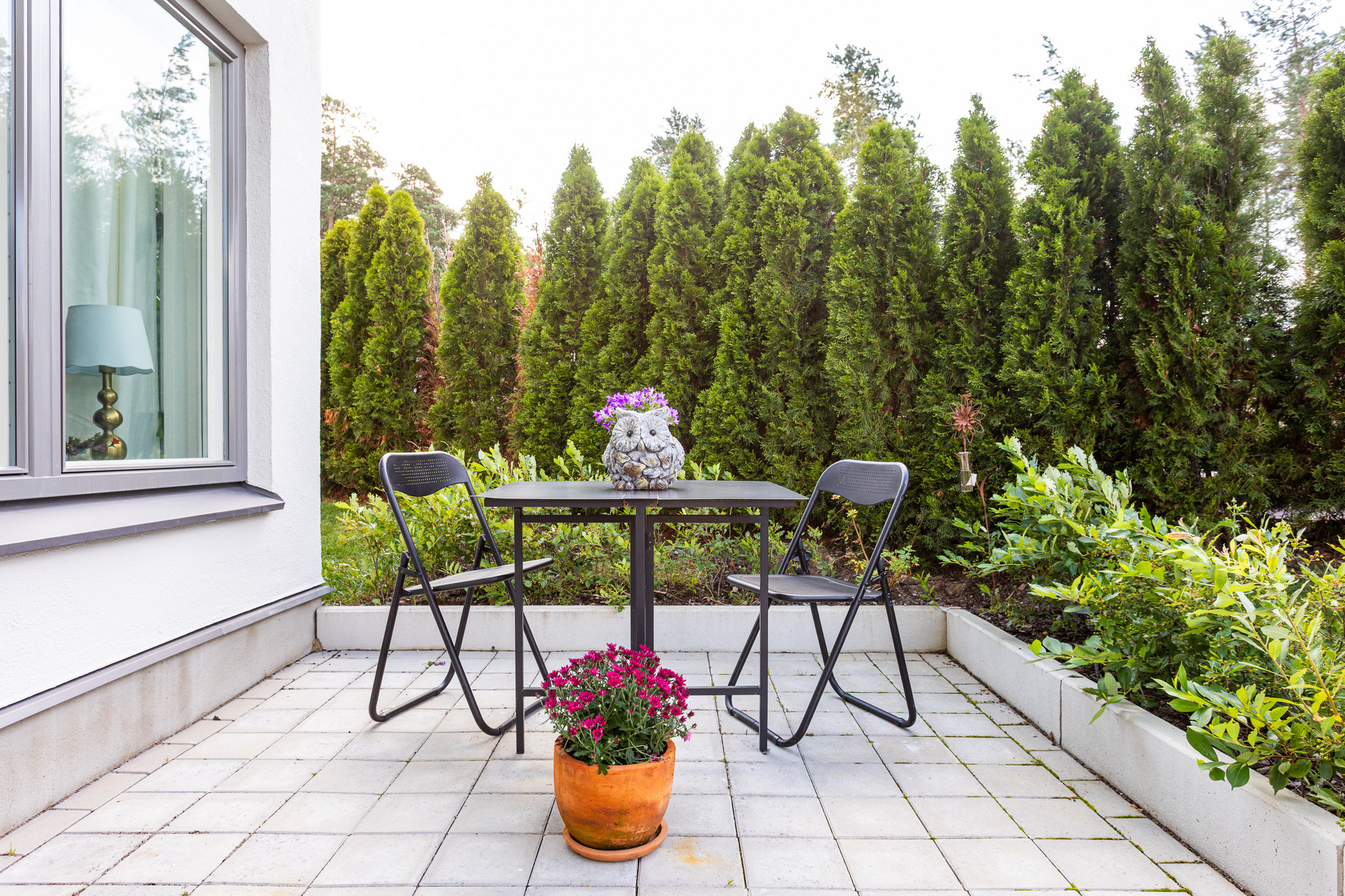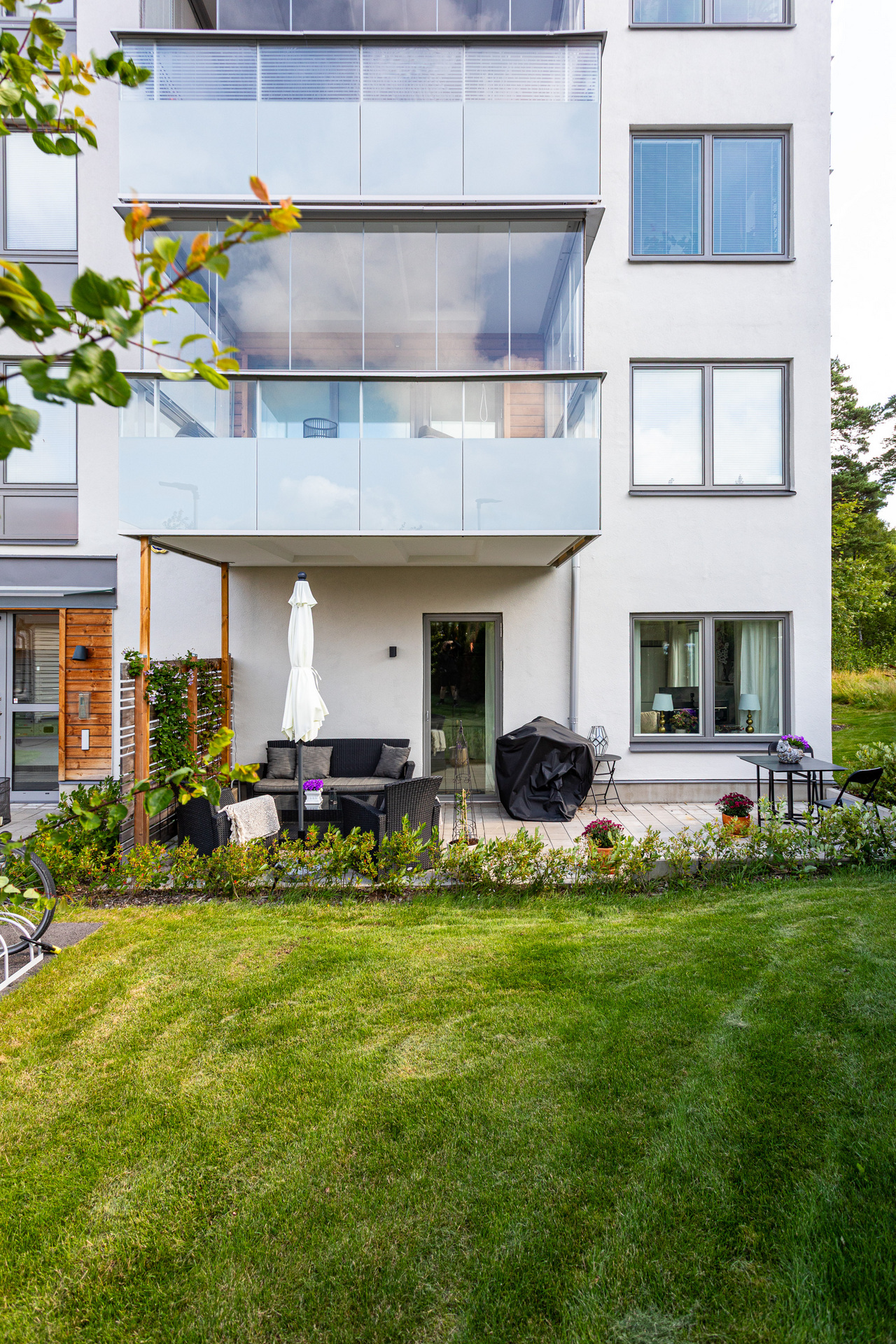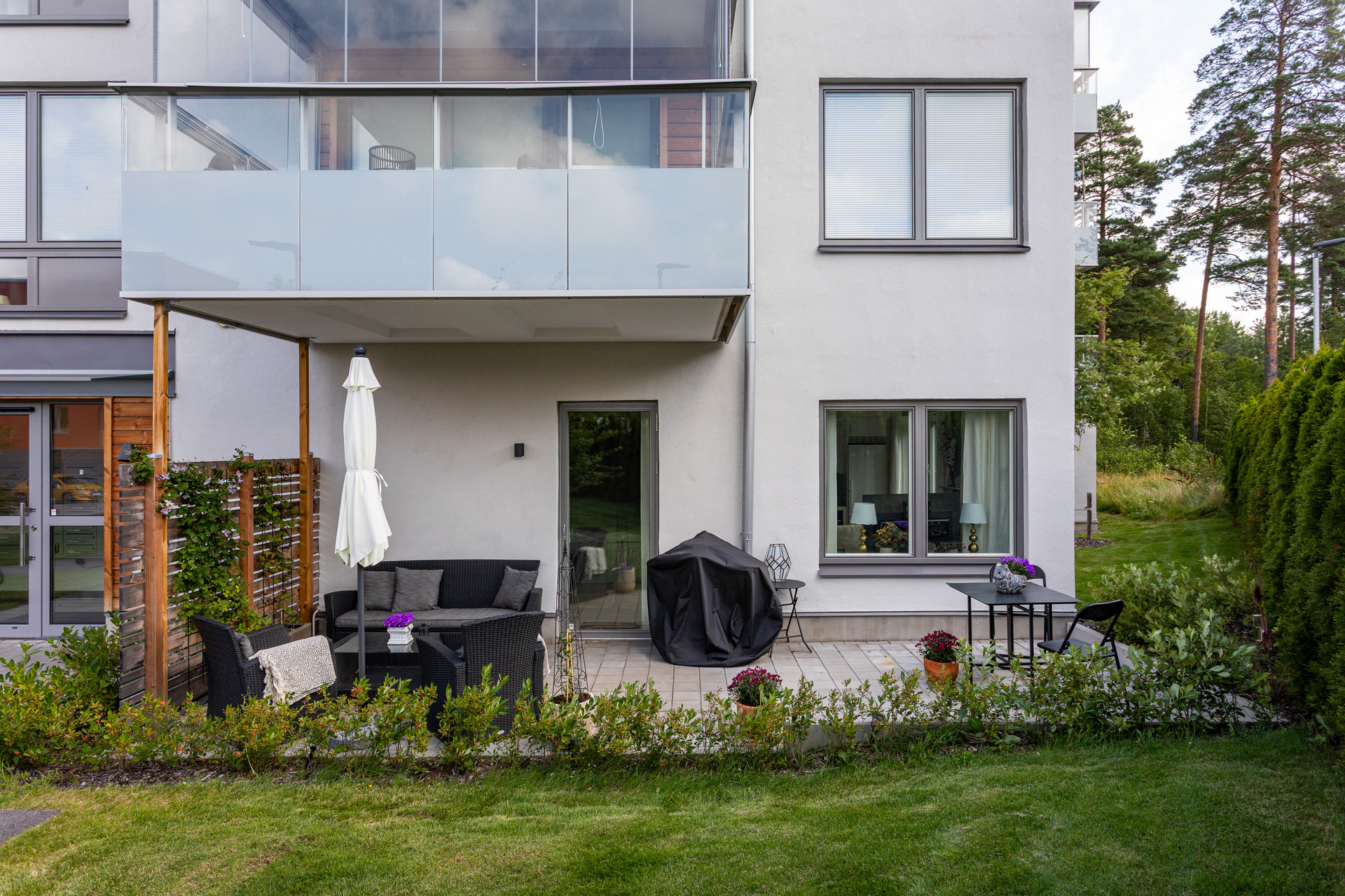 Stor uteplats i markplan med ett soligt söder läge. På uteplatsen ryms både loungegrupp och matgrupp samt elgrill (annan grill är ej tillåten).