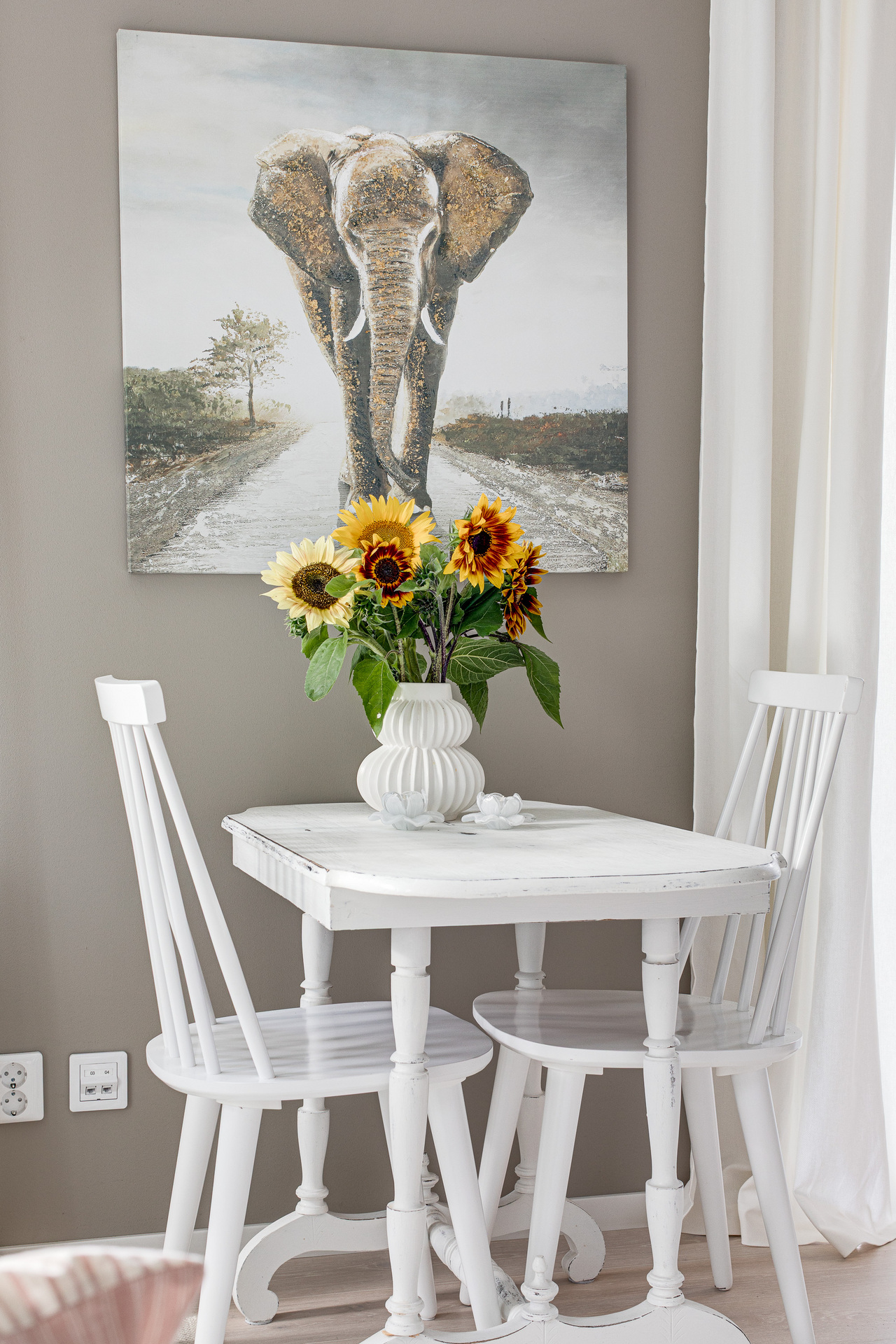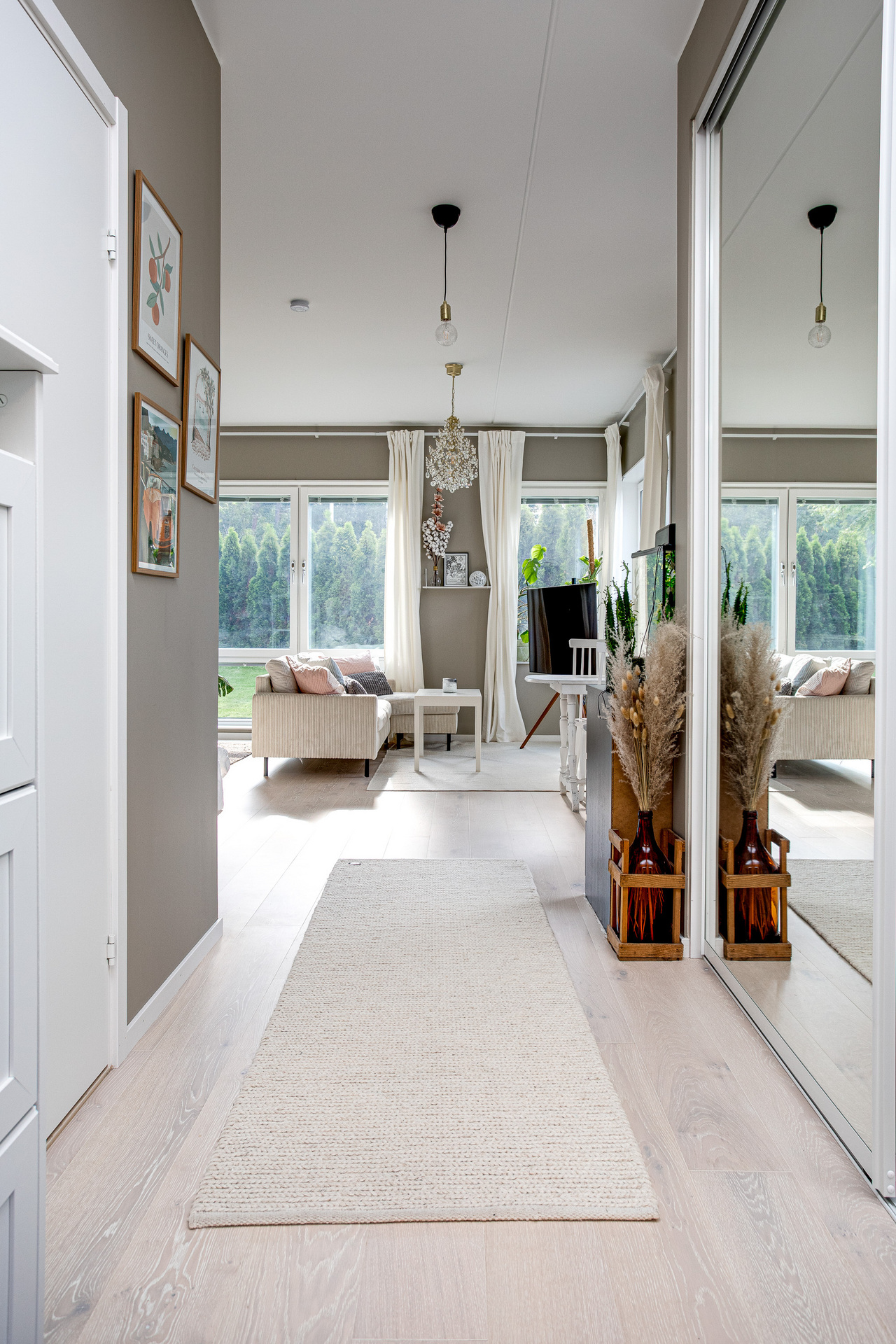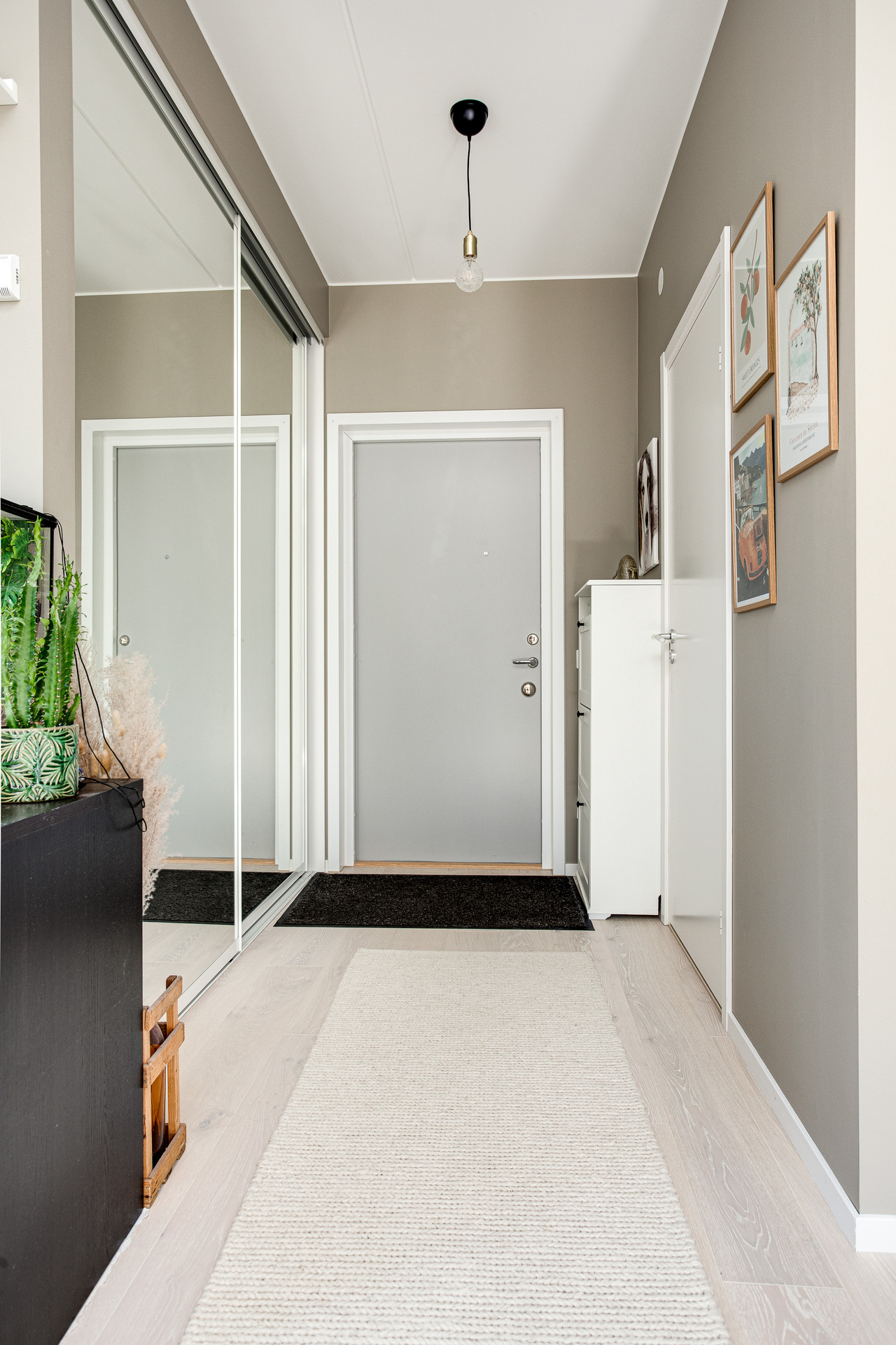 Välkommen in i denna trivsamma och ljusa bostad. Hallen har ett fint vitlaserat trägolv som löper vidare i hela lägenheten. Väggarna är ljust målade och precis vid entrén finns en rymlig skjutdörrsgarderob med spegeldörrar.