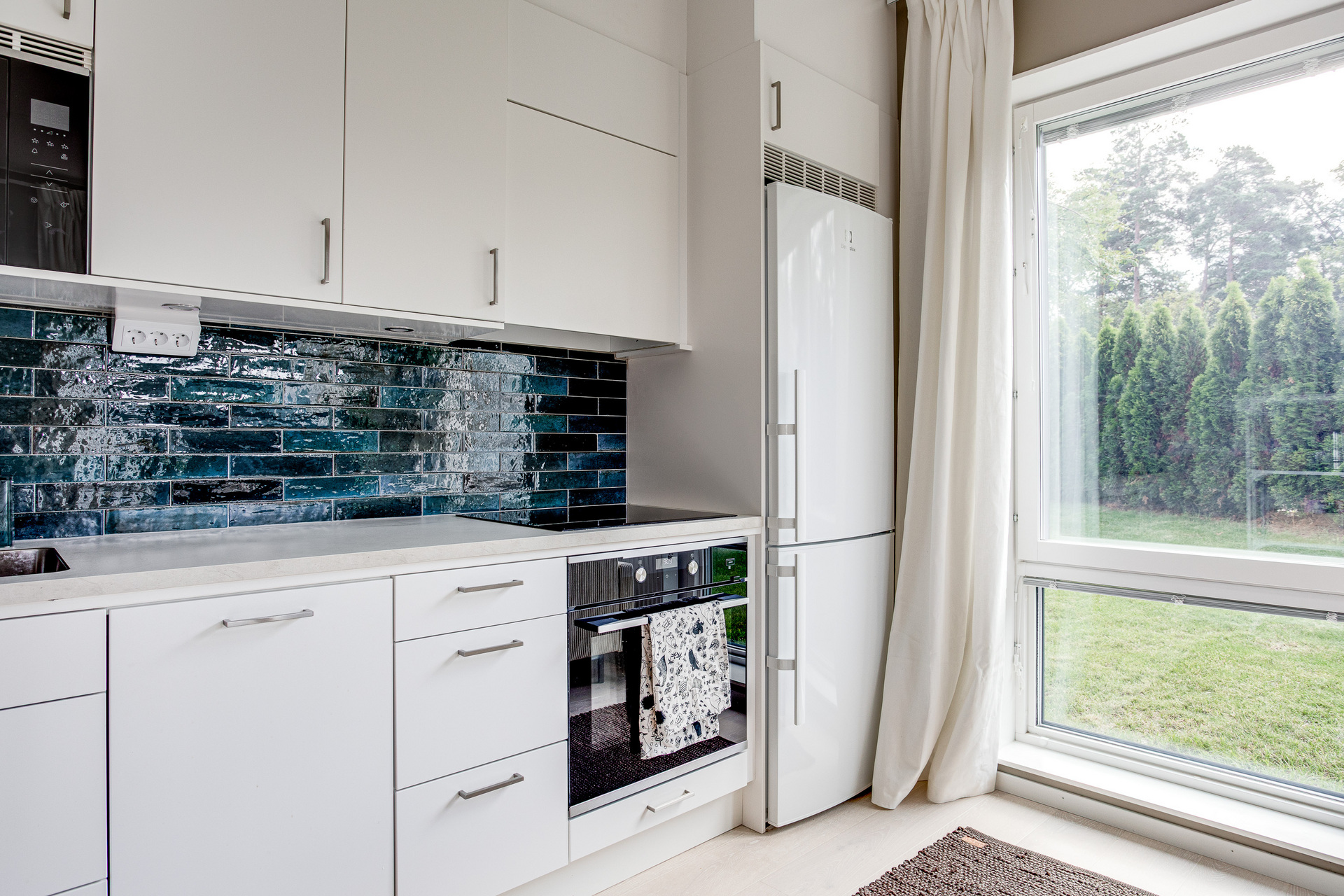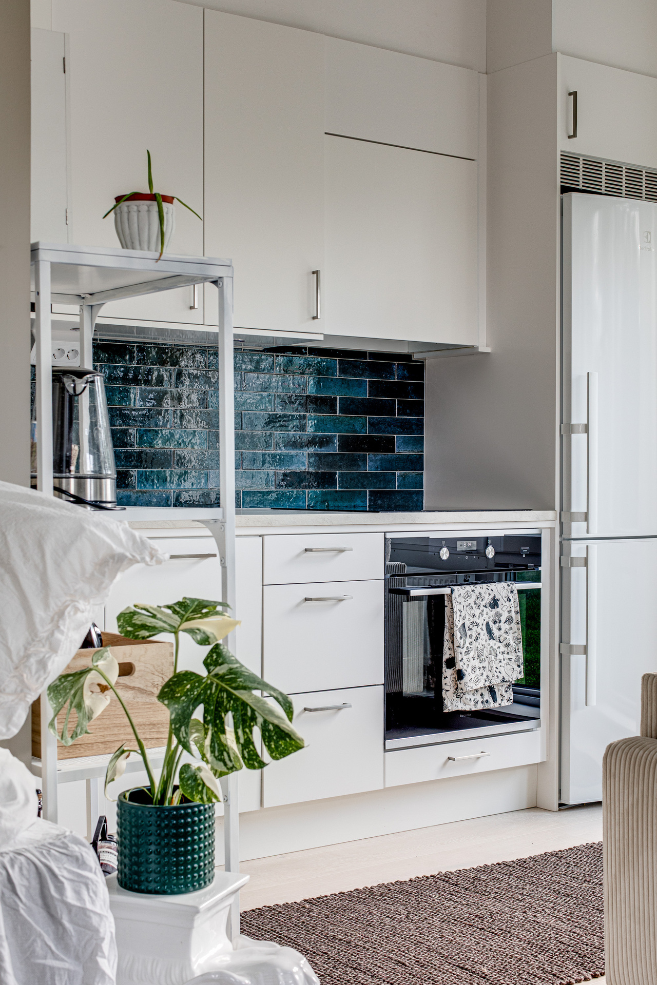Köket har allt man behöver, bra förvaring i både under- och överskåp, bra bänkyta och utrustat med diskmaskin, ugn, induktionshäll, fläkt, mikro och kyl/frys. Vita köksluckor, vit bänkskiva och ett väldigt snyggt kakel till det.