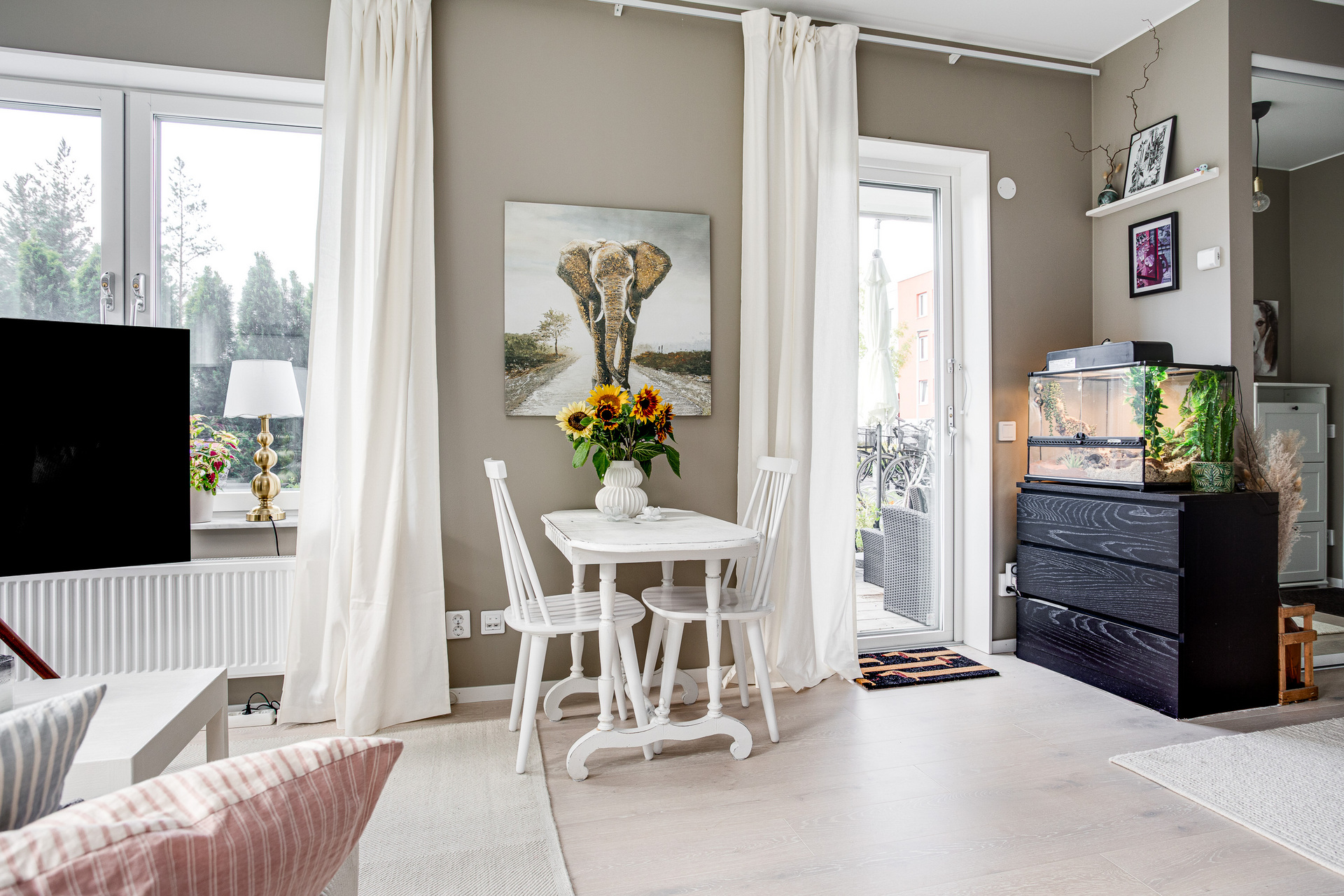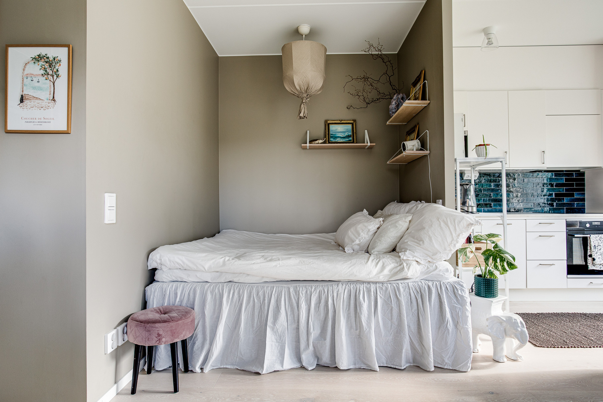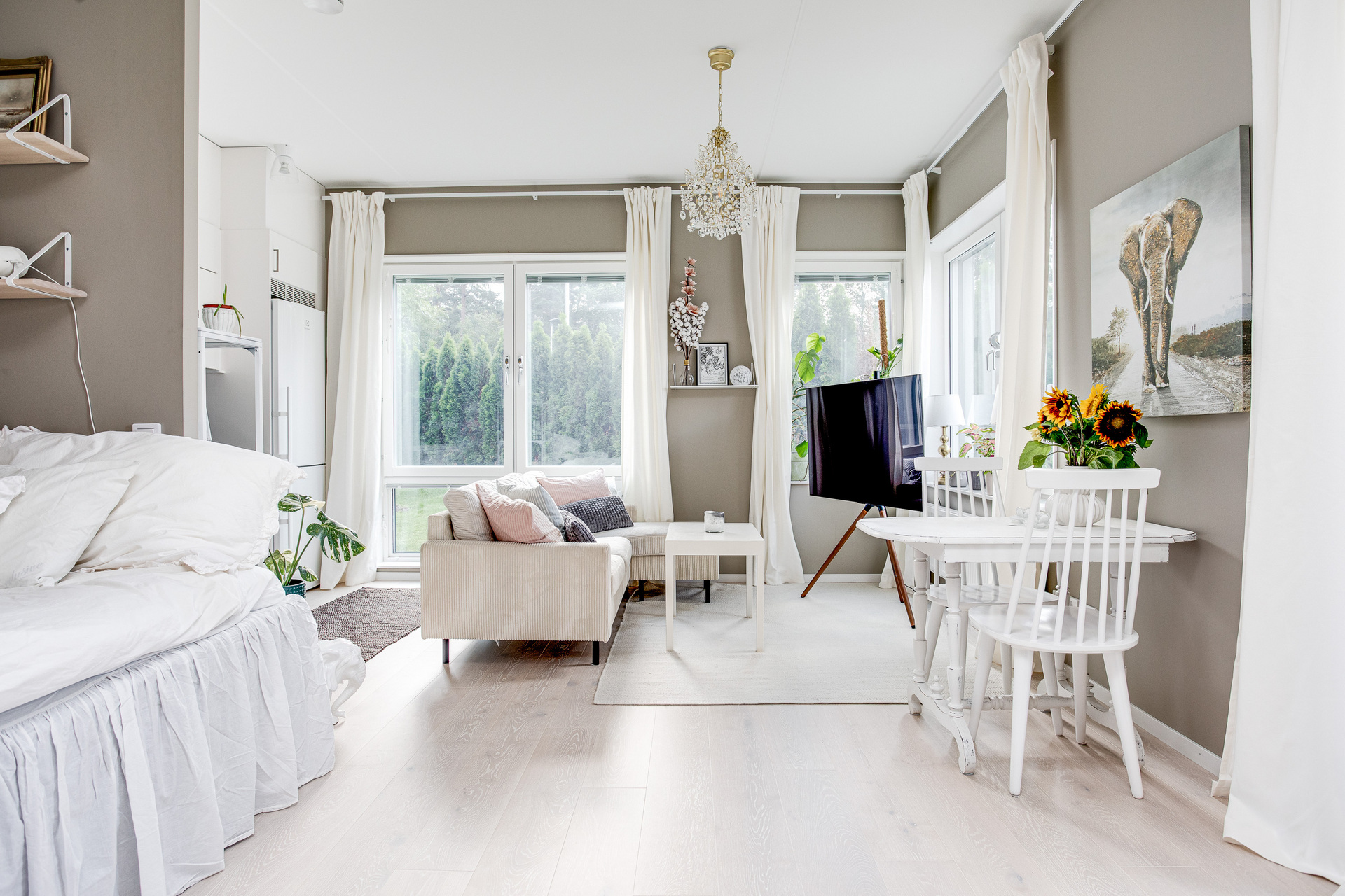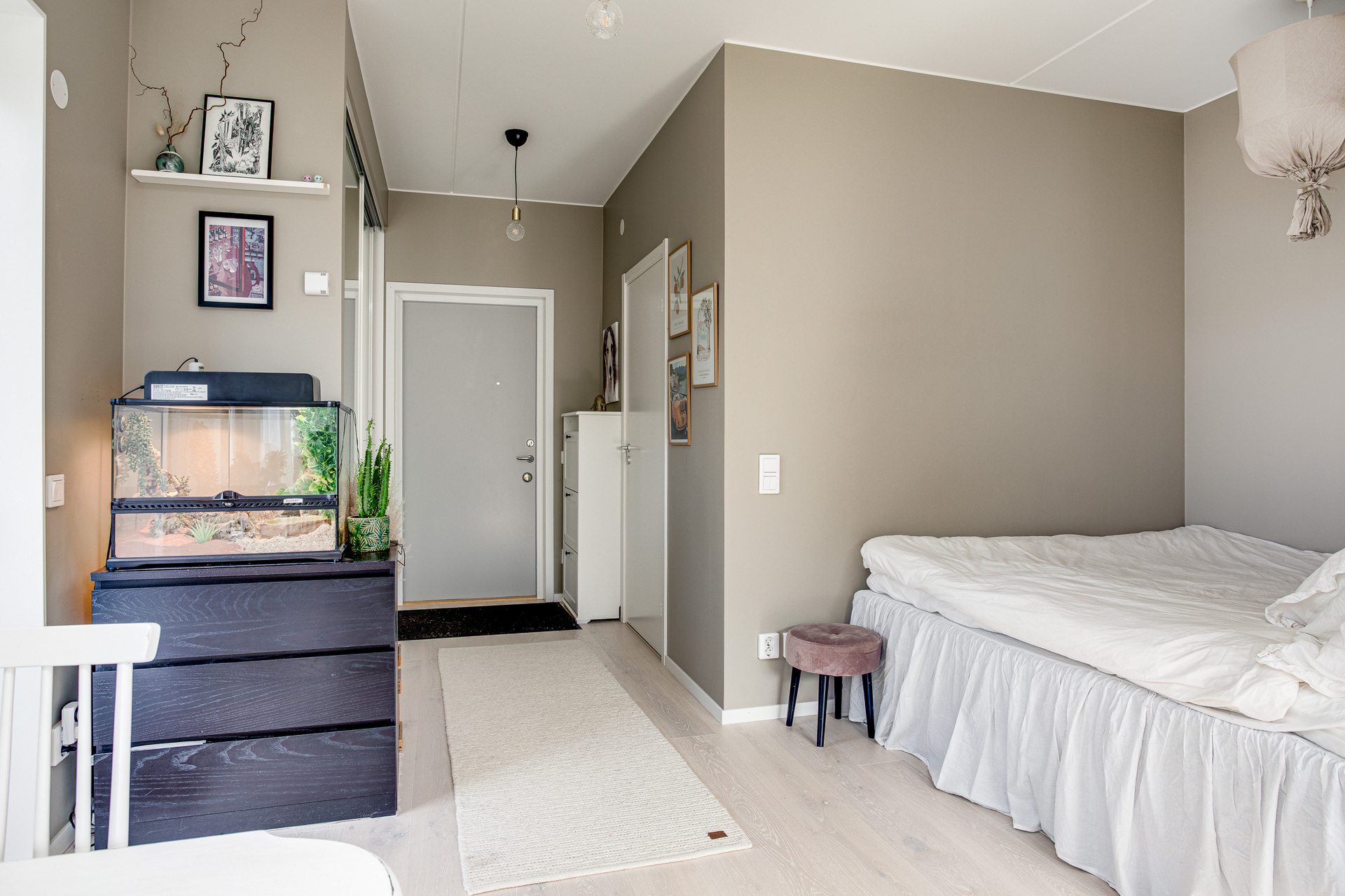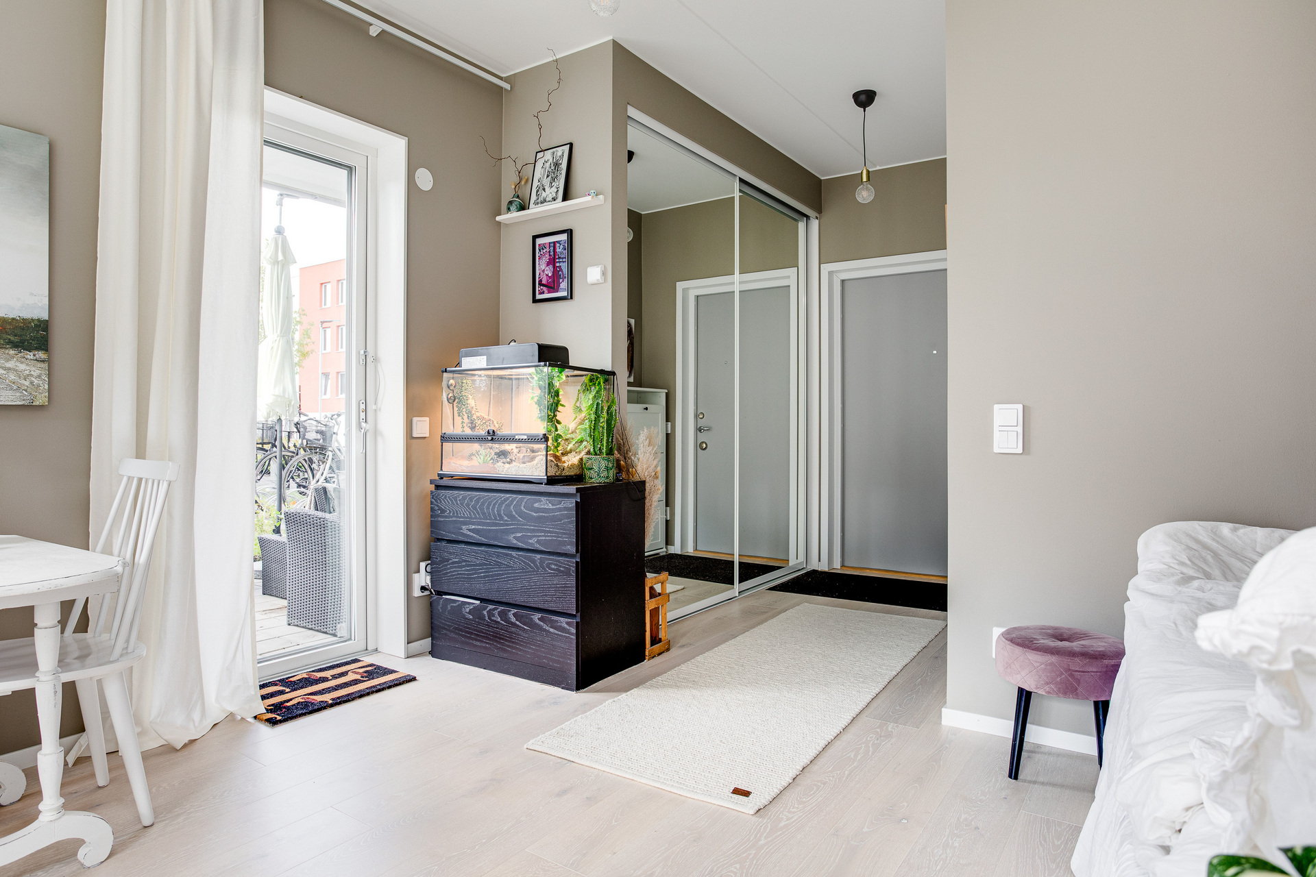 Ett ljust rum med generösa fönster åt två väderstreck, samt helglasad dörr till uteplatsen. Rummet kan möbleras med både soffa och matbord, här får man en härlig yta att umgås på. Sängen har en given plats i den praktiska sovalkoven, som har en något mörkare kulör av beige på väggarna.