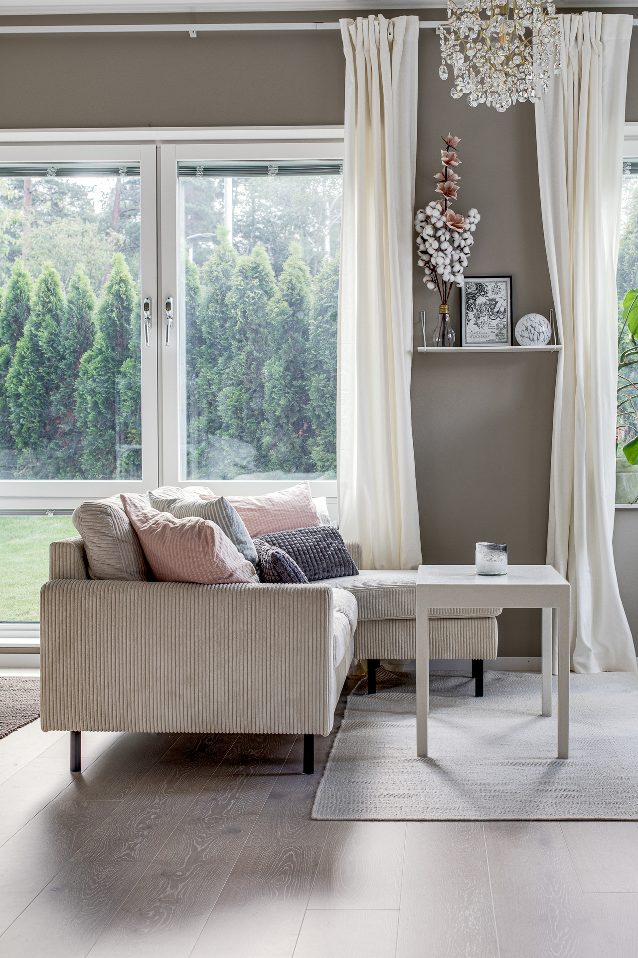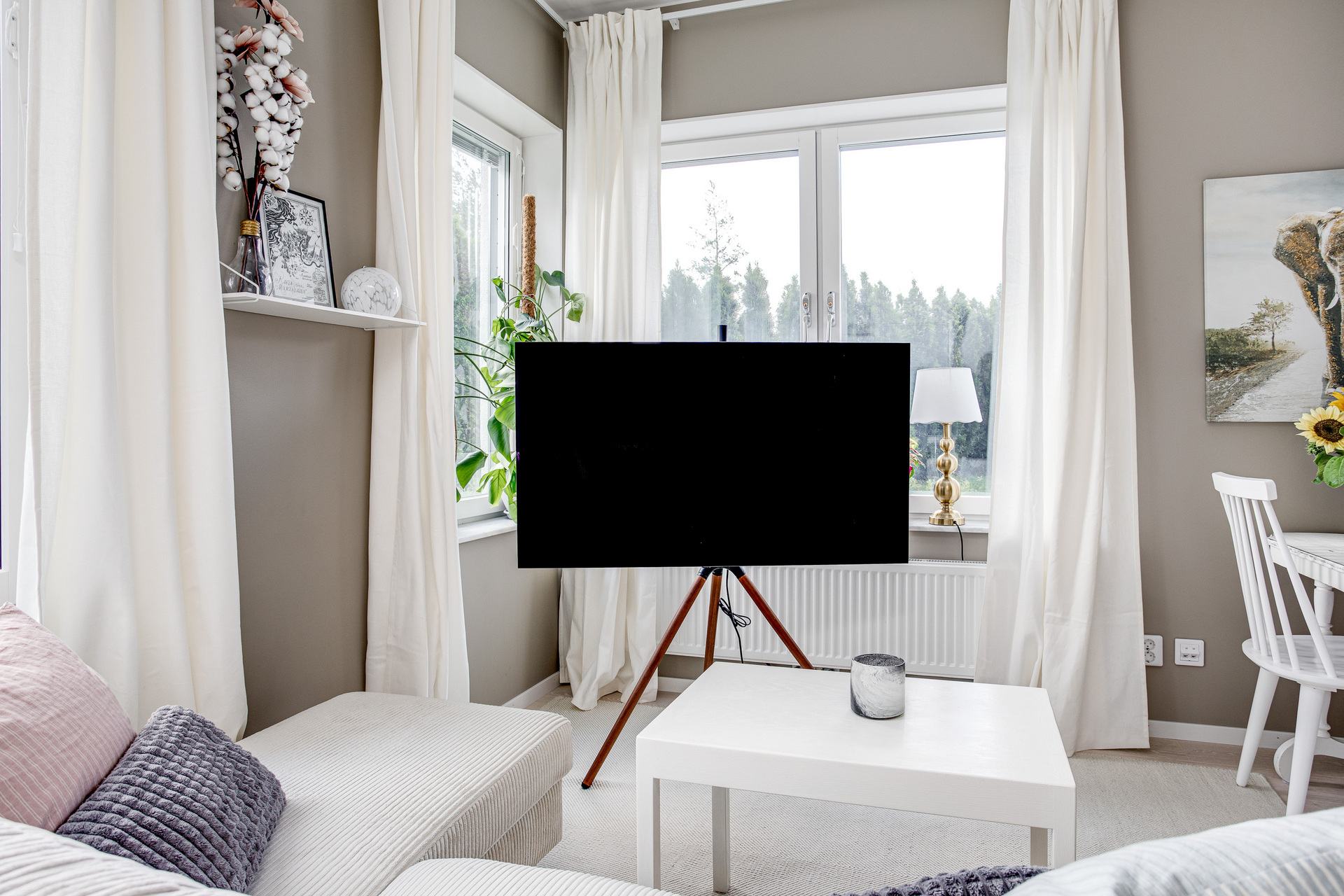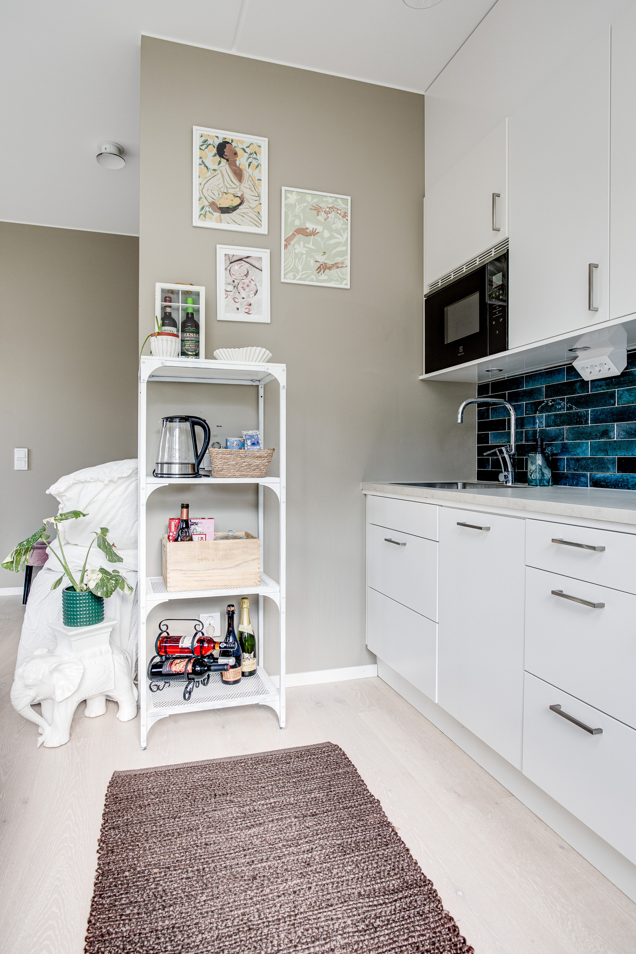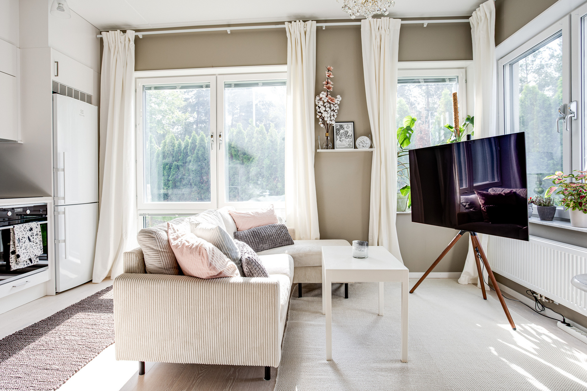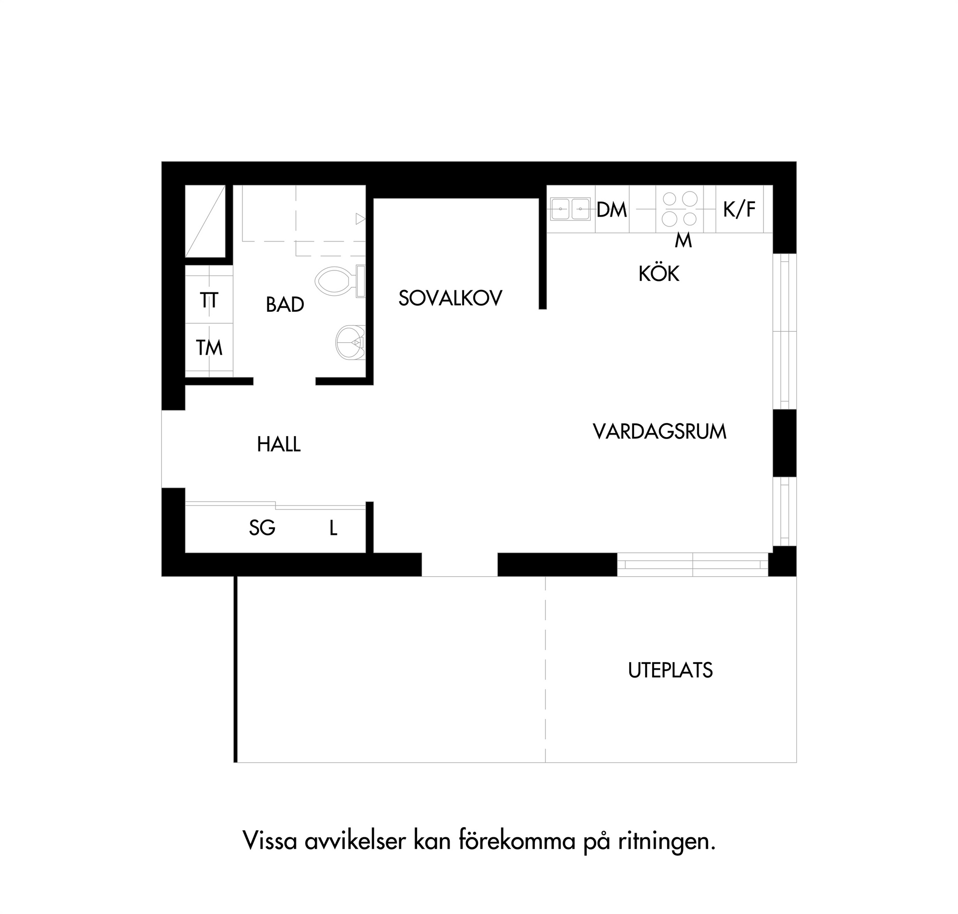Ett ljust rum med generösa fönster åt två väderstreck, samt helglasad dörr till uteplatsen. Rummet kan möbleras med både soffa och matbord, här får man en härlig yta att umgås på. Sängen har en given plats i den praktiska sovalkoven, som har en något mörkare kulör av beige på väggarna.