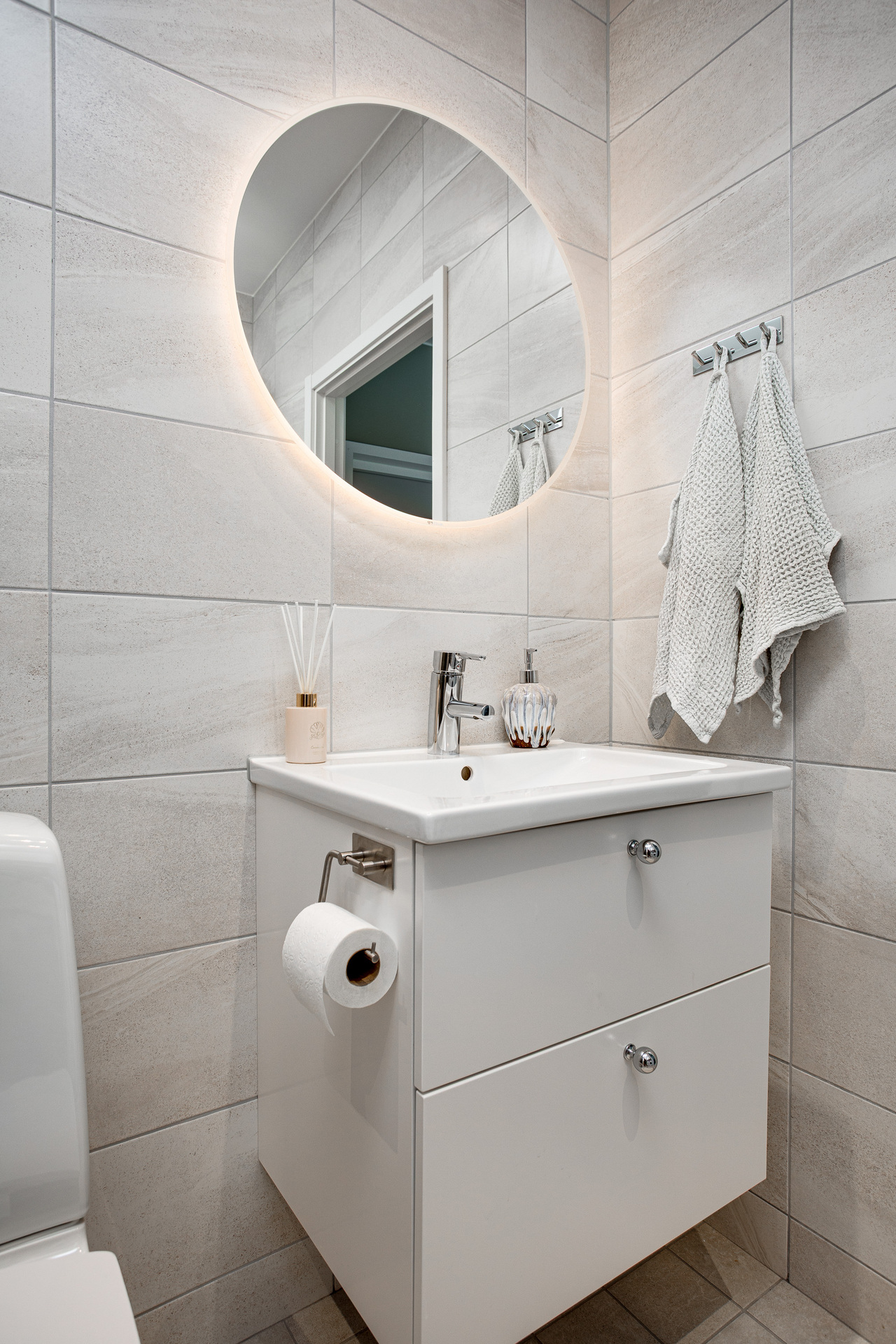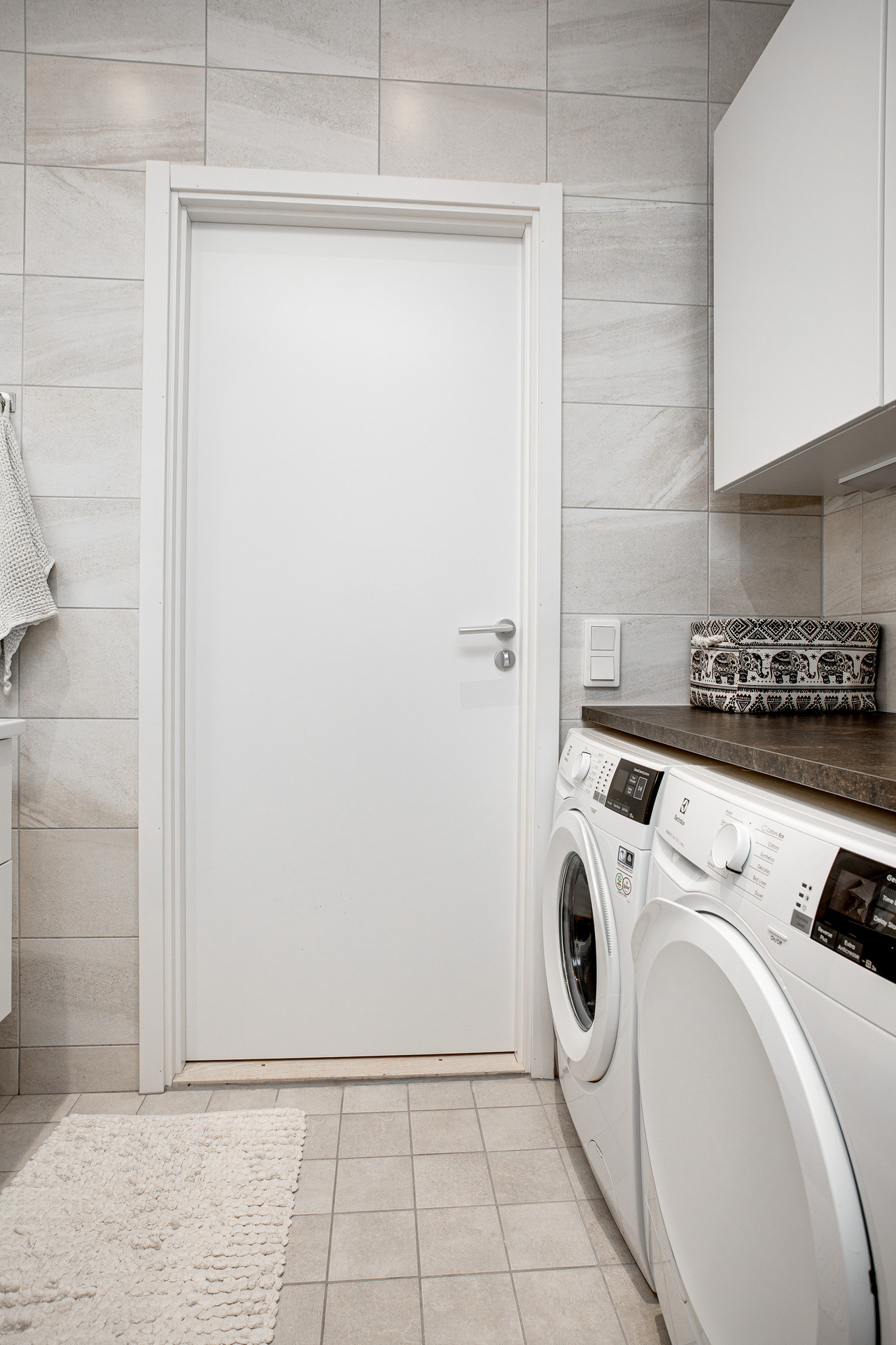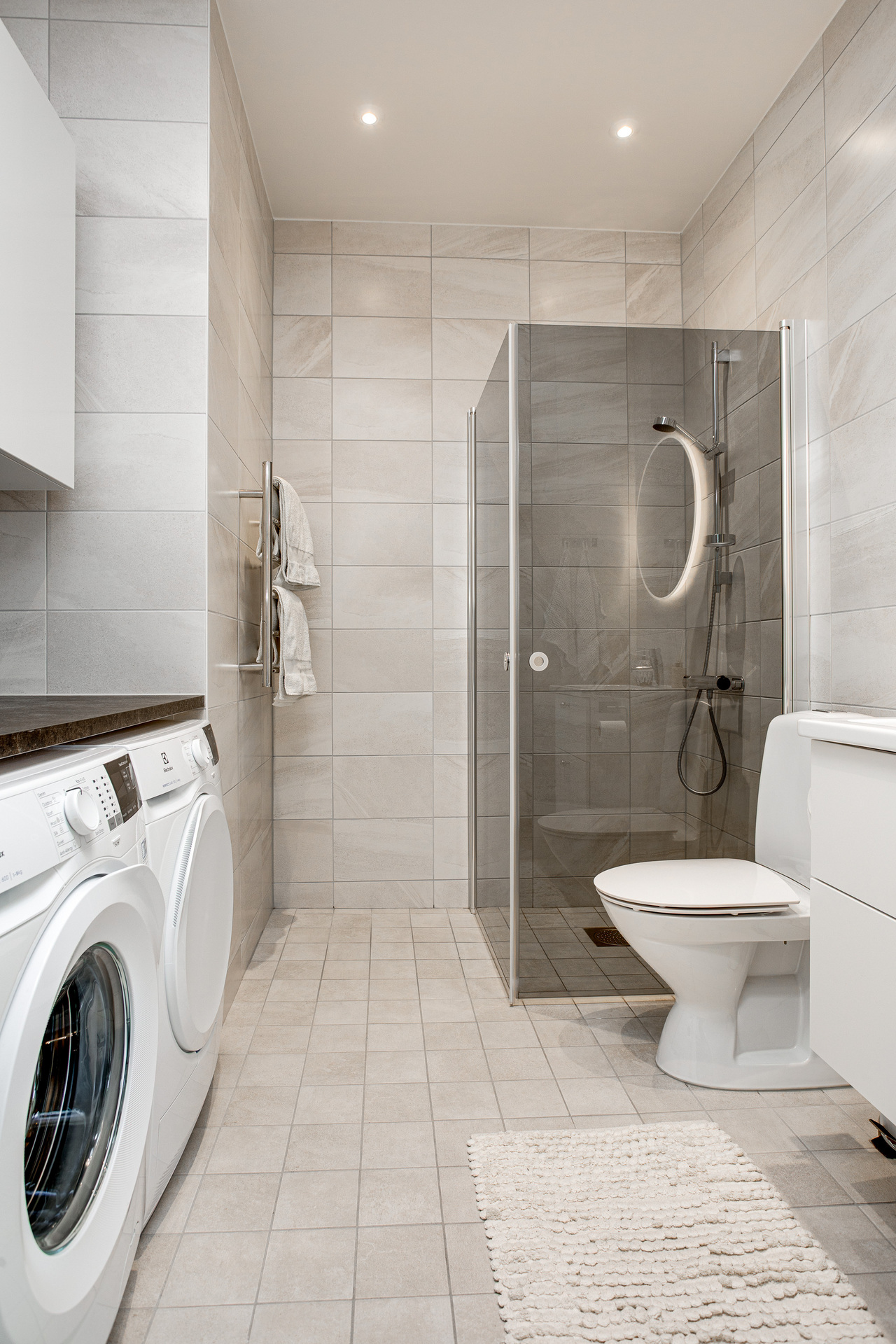 Rymligt duschrum med enhetligt klinker och kakel. Duschplats med glasdörrar i mörkt glas, handfat med kommod och rund spegel med belysning, handdukstork och spotlights. Här finns också både tvättmaskin och torktumlare med arbetsbänk och överskåp.
